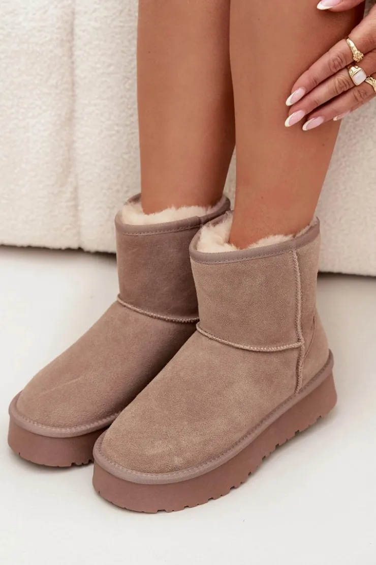 Śniegowce damskie wykonane z naturalnego zamszu. Wnętrze ocieplone miękkim futerkiem gwarantuje komfort i ciepło nawet w mroźne dni. Osadzone na platformie z gumowego tworzywa skutecznie izolują od chłodnego podłoża, zapewniając wygodę podczas codziennego użytkowania. To idealny wybór na zimowe wyjścia – praktyczne, modne i komfortowe. Przy wyborze rozmiaru prosimy sugerować się tabelą rozmiarów.