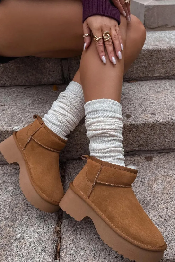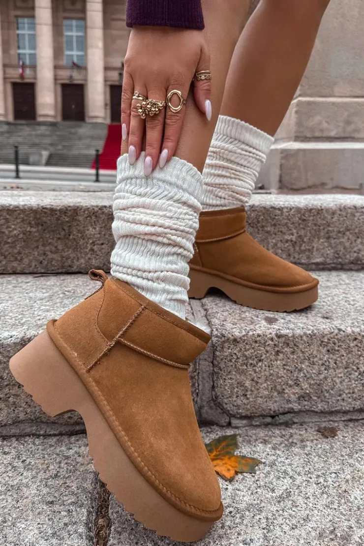 Śniegowce damskie wykonane z naturalnego zamszu to stylowa propozycja na zimowe dni. Osadzone na platformie, zapewniają stabilność i wygodę podczas chodzenia, jednocześnie skutecznie izolując od chłodu. Wnętrze butów zostało ocieplone futerkiem, które gwarantuje ciepło i komfort w mroźne dni. Modny fason sprawia, że śniegowce doskonale wpisują się w aktualne trendy. To idealny wybór dla kobiet, które cenią styl i wygodę w zimowych stylizacjach.