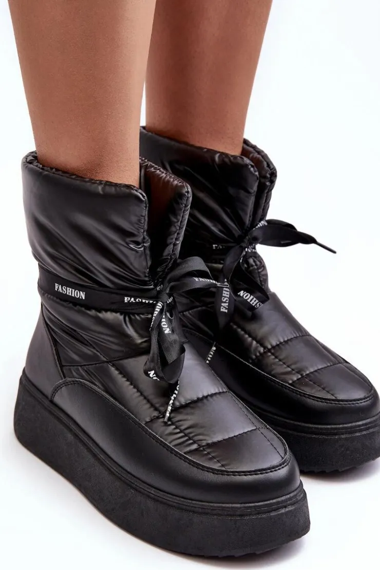 Stylowe, damskie śniegowce zostały wykonane z połączenia eko skóry i materiału tekstylnego. Osadzone na masywnej platformie. Wykonane z materiału tekstylnego. Grube ocieplenie w postaci futerka zapewni ochronę przed zimnem. Model wsuwany z ozdobnym wiązaniem na cholewce. Przy wyborze rozmiaru prosimy sugerować się tabelą rozmiarów.