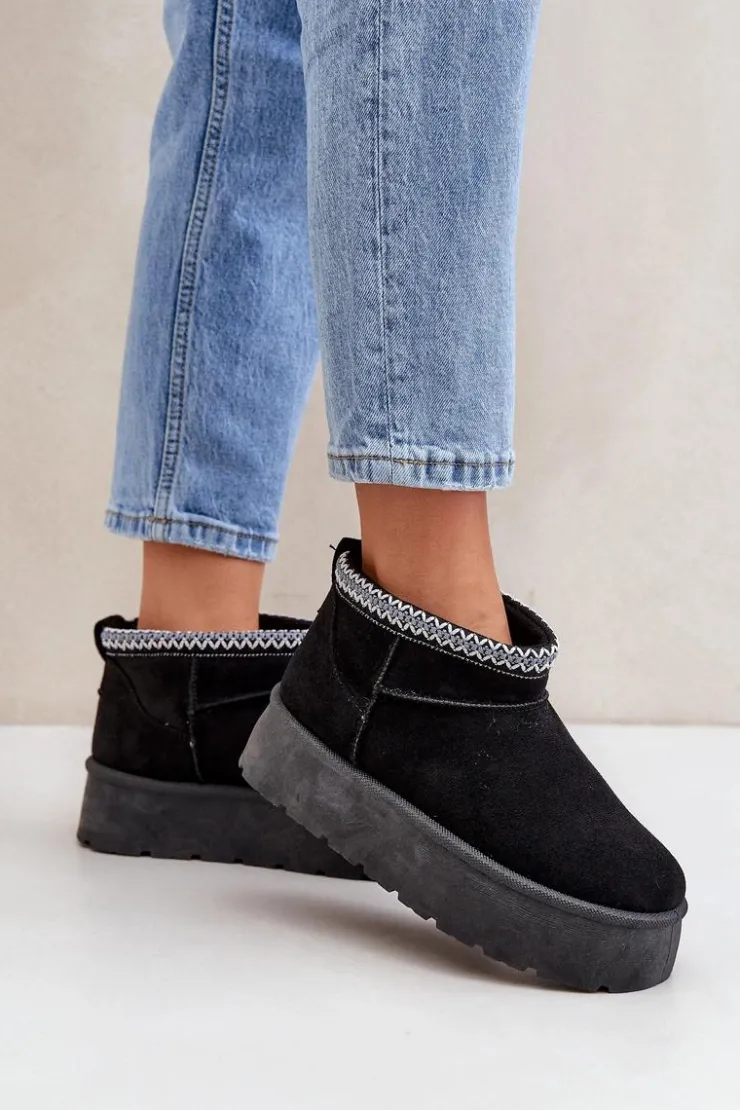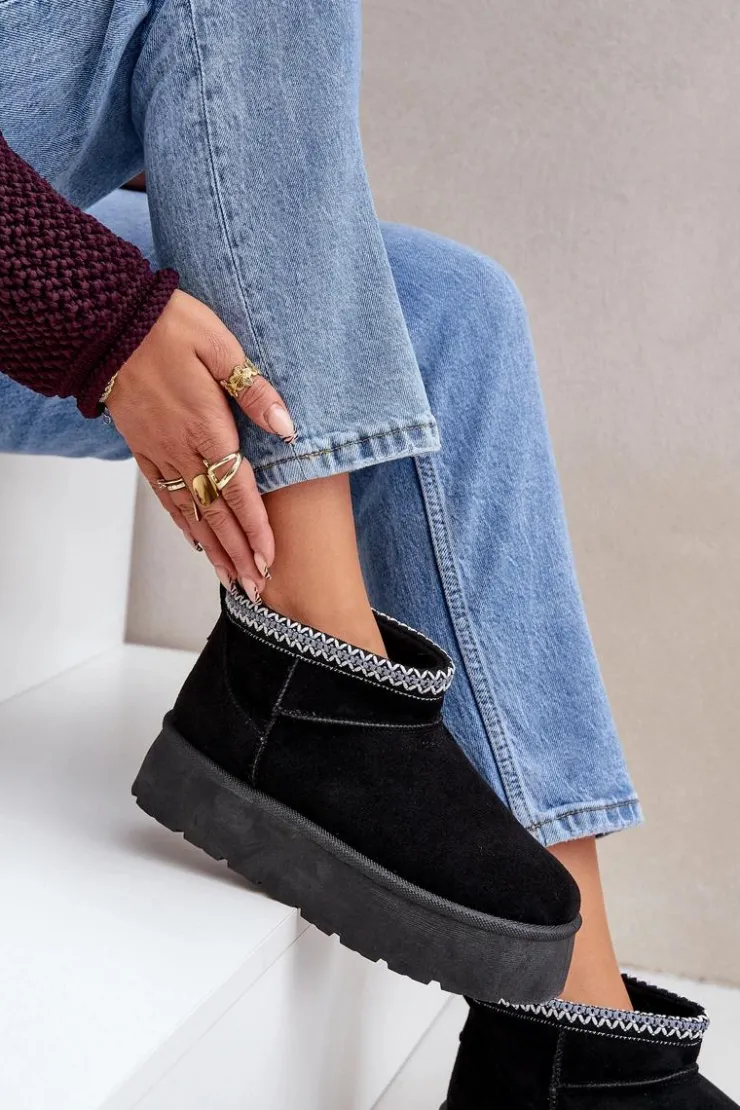 Stylowe śniegowce damskie wykonane z eko zamszu. Osadzone na platformie, która skutecznie izoluje od zimnego podłoża. Wnętrze butów ocieplane miękkim futerkiem, zapewniającym ciepło i komfort w mroźne dni. Górę cholewki zdobi subtelny haft, dodający wyjątkowego uroku. Idealny wybór na zimowe spacery i codzienne aktywności w chłodne dni! Przy wyborze rozmiaru prosimy kierować tabelą rozmiarów.
