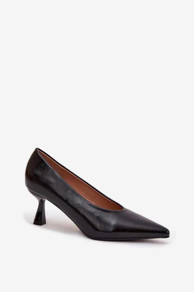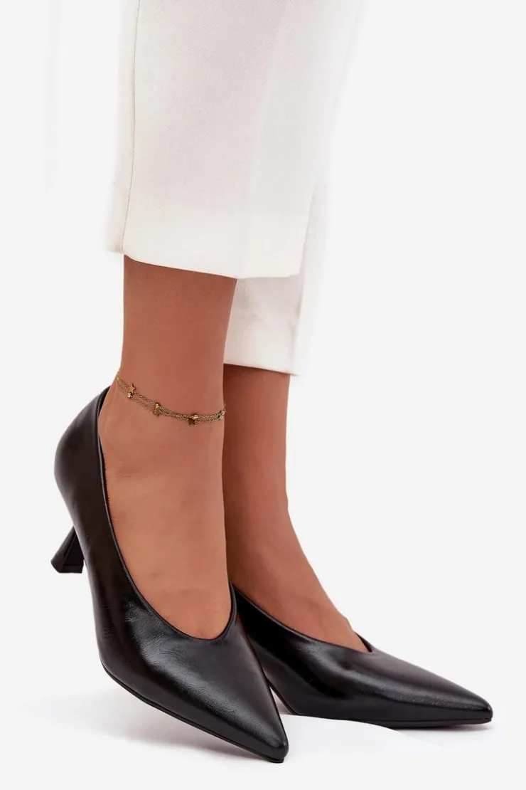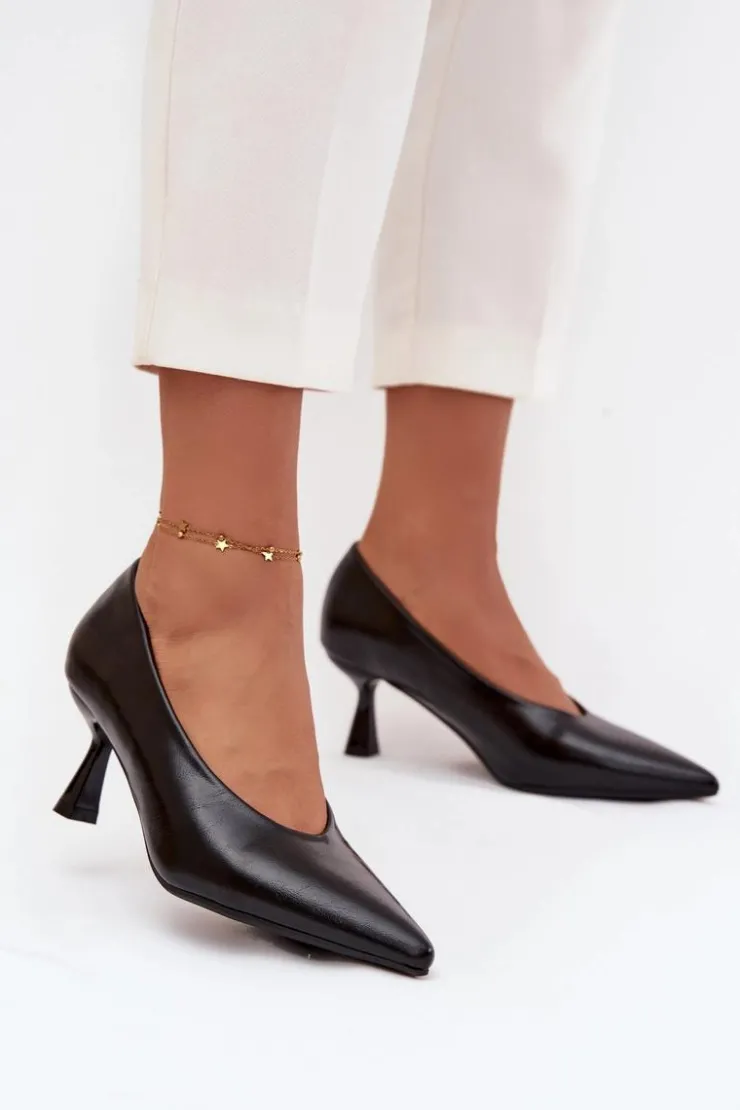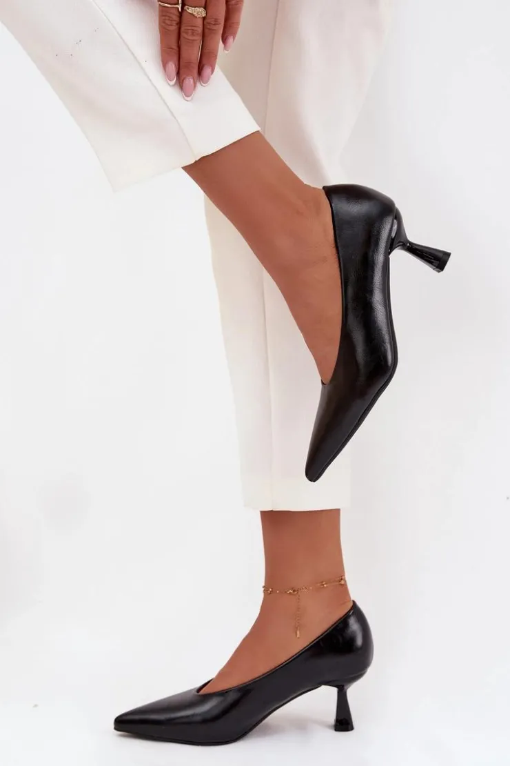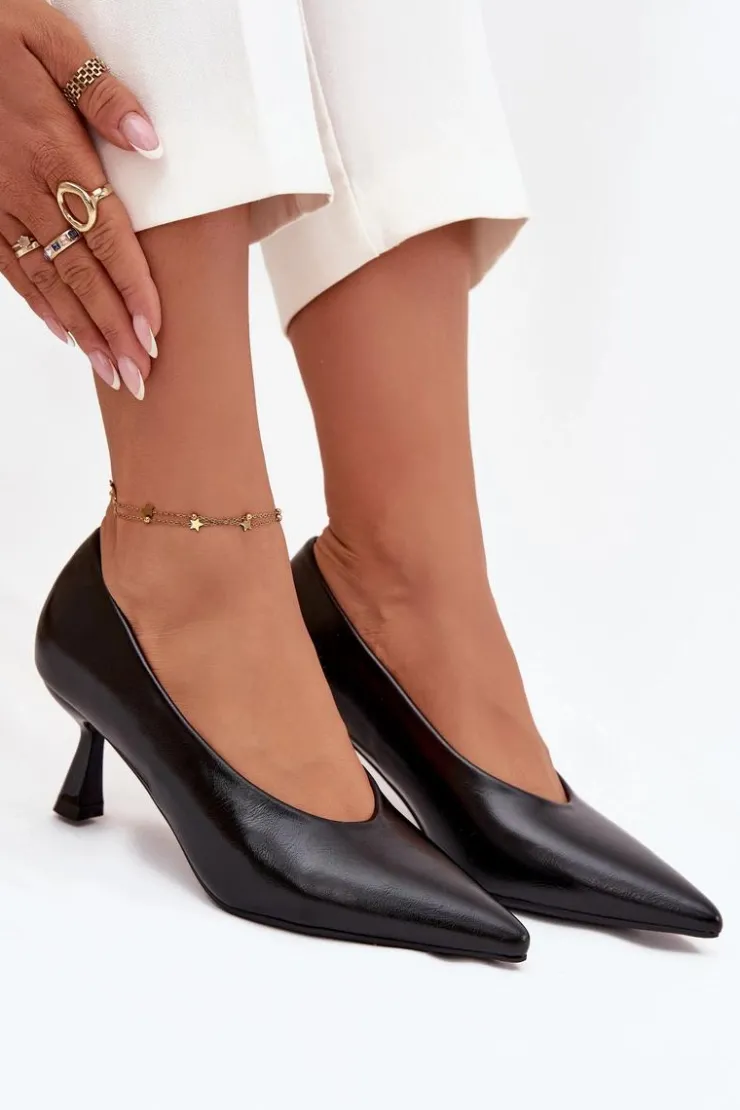 Eleganckie czółenka wykonane z eko skóry to klasyczna propozycja dla kobiet, które cenią styl i wygodę. Smukła linia buta ze szpiczastymi noskami pięknie wysmukla stopę i dodaje sylwetce lekkości, podkreślając kobiecy charakter obuwia. Model został osadzony na stabilnym obcasie typu rozszerzana szpilka, który łączy elegancki wygląd ze zwiększoną wygodą noszenia – zapewnia pewność kroku, a jednocześnie dodaje nowoczesnego akcentu. Dzięki swojemu ponadczasowemu fasonowi czółenka te doskonale sprawdzą się zarówno w stylizacjach biurowych, jak i podczas wyjątkowych okazji. Idealnie komponują się z sukienkami, spódnicami czy eleganckimi spodniami, stanowiąc niezawodne dopełnienie kobiecej garderoby. Przy wyborze rozmiaru prosimy kierować się tabelą rozmiarów.