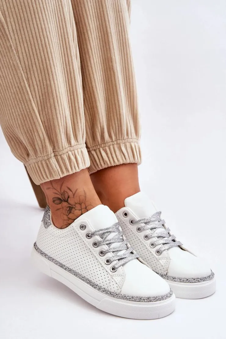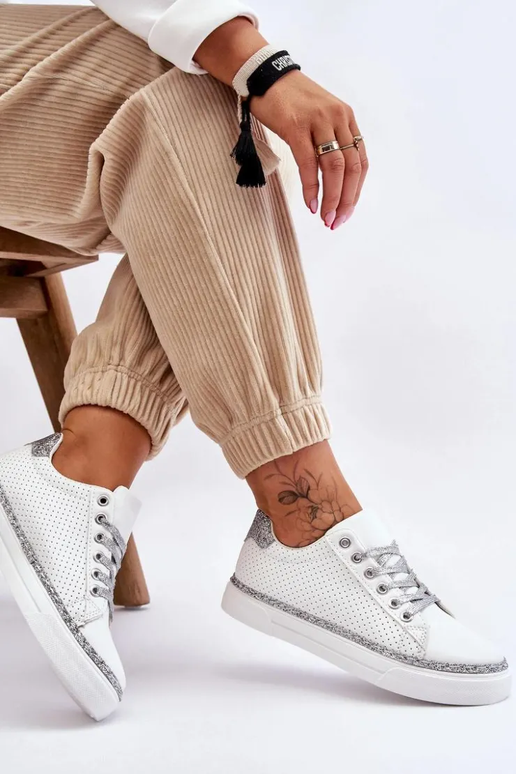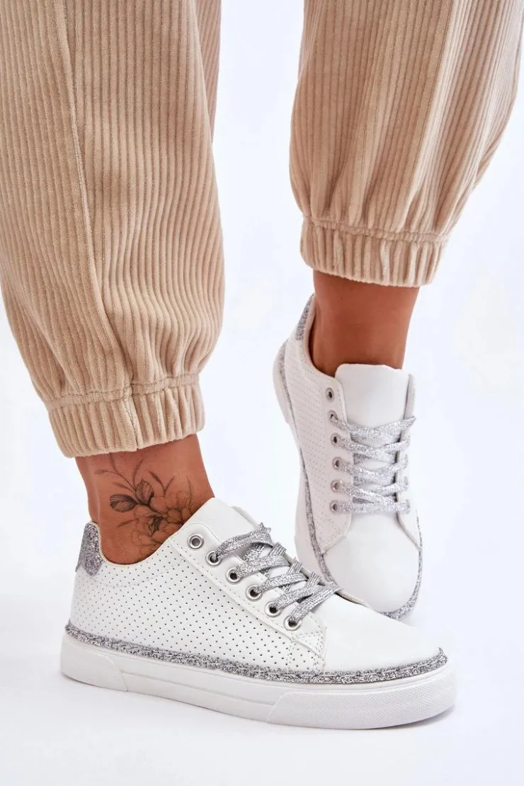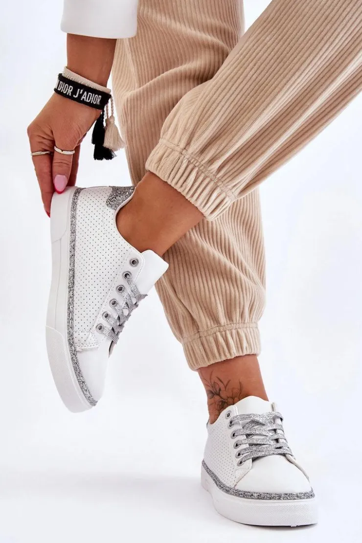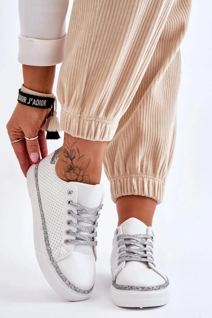 Klasyczne, damskie trampki zostały wzbogacone perforacją po bokach cholewki oraz brokatem. Wokół platformy znajduje się ozdobne przeszycie. Trampki posiadają miękką wkładkę, którą można wyjąć. Model ten posiada klasyczne sznurowanie. Idealne buty do codziennego użytkowania! Powinnaś je mieć! Przy wyborze rozmiaru prosimy sugerować się tabelą rozmiarów.