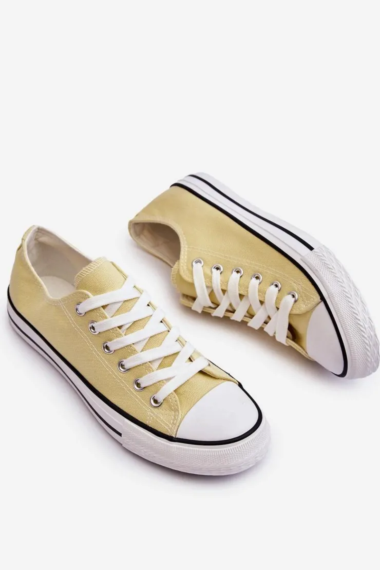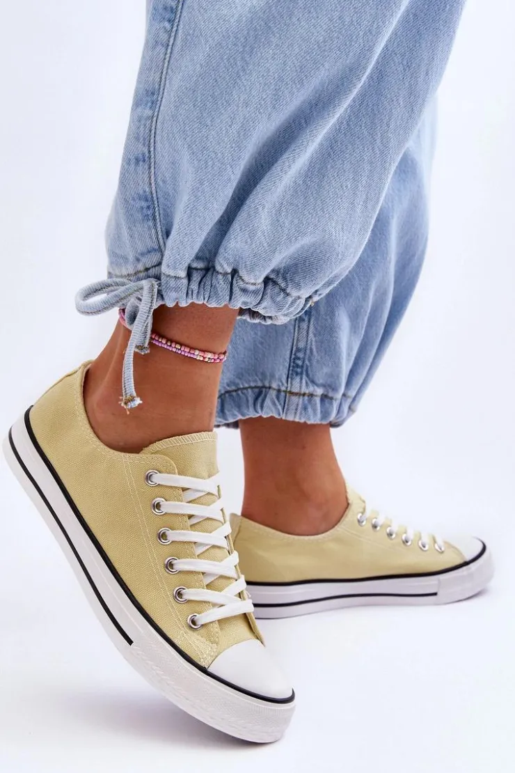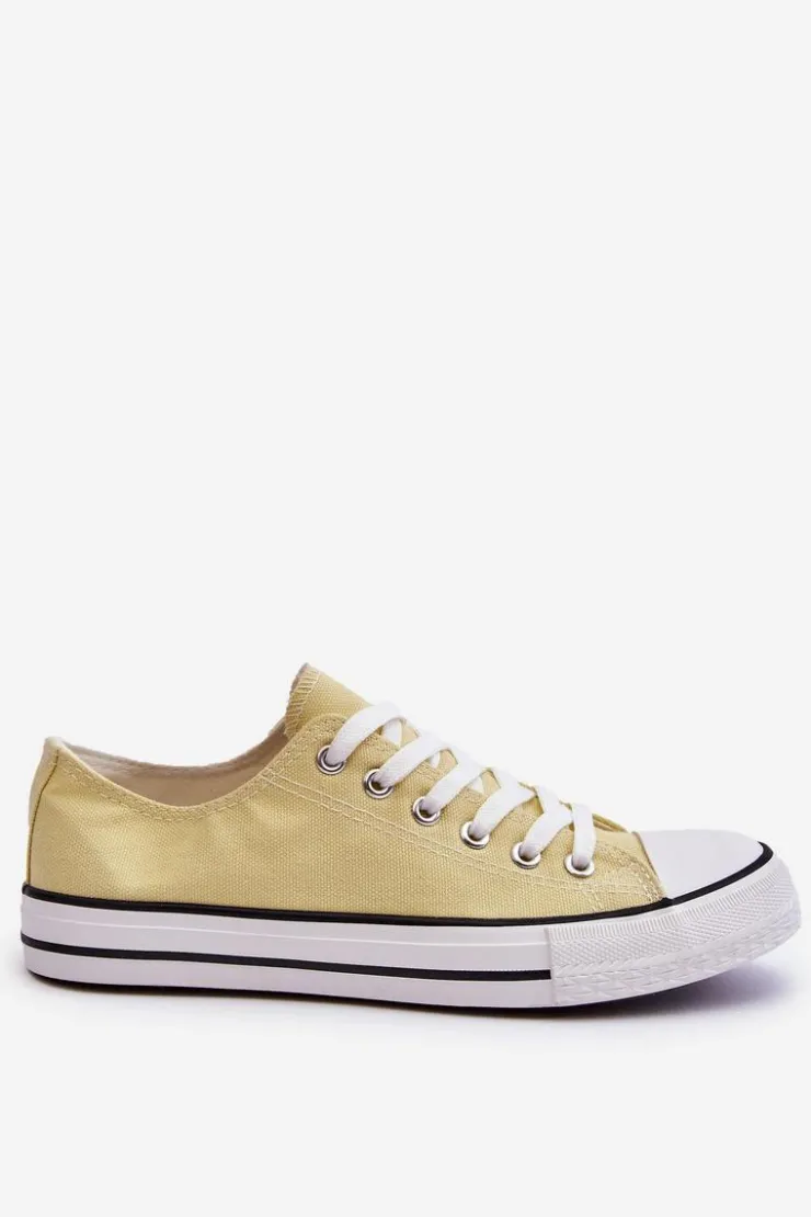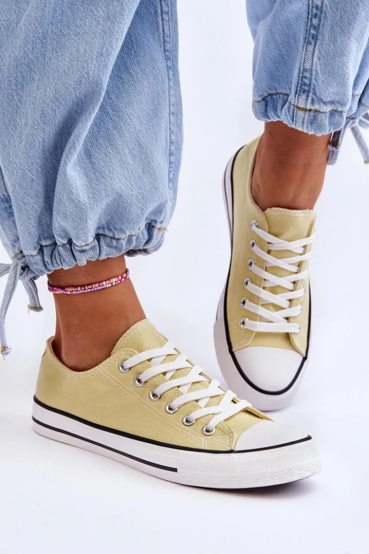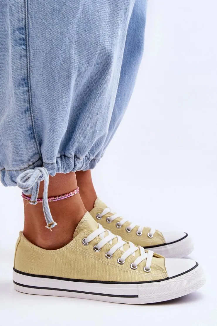 Klasyczne, sznurowane trampki damskie zostały wykonane z materiału tekstylnego. Posiadają gumową podeszwę, która jest dodatkowo antypoślizgowa. Ponadczasowy model, który powinnaś mieć w swojej szafie! Z pewnością założysz je do wielu stylizacji! Nosek został wzmocniony gumowym tworzywem. Wygodna, materiałowa wkładka zapewni komfort podczas użytkowania. Przy wyborze rozmiaru prosimy sugerować się tabelą rozmiarów.