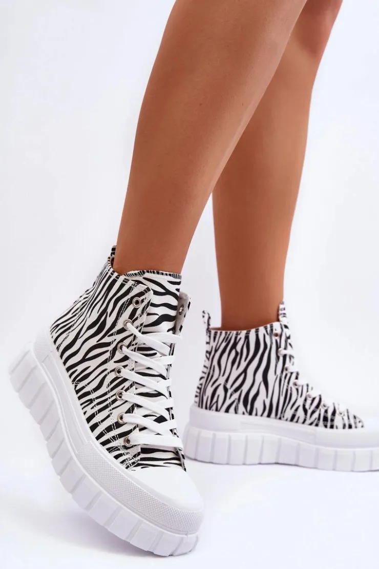 Stylowe, wysokie trampki damskie zostały wykonane z materiału tekstylnego. Model ten jest klasycznie sznurowany i ozdobiony zwierzęcym wzorem. Buty zostały osadzone na masywnej, gumowej platformie. Z pewnością zakochasz się w tym modelu! Przy wyborze rozmiaru prosimy sugerować się tabelą rozmiarów.