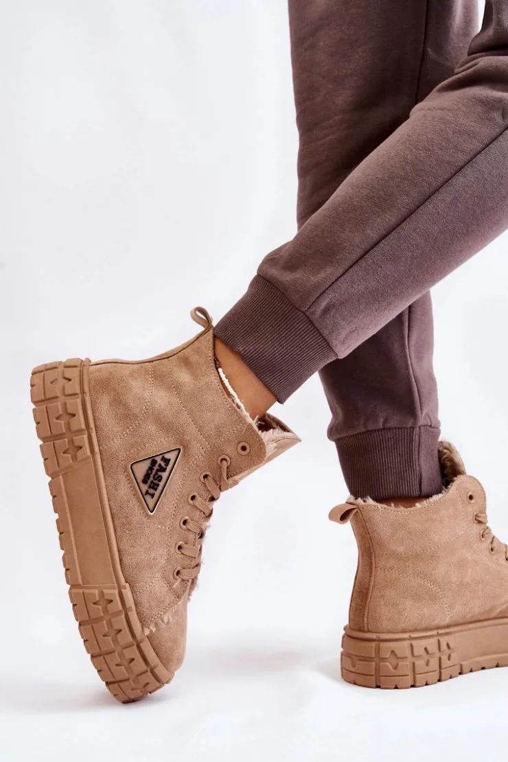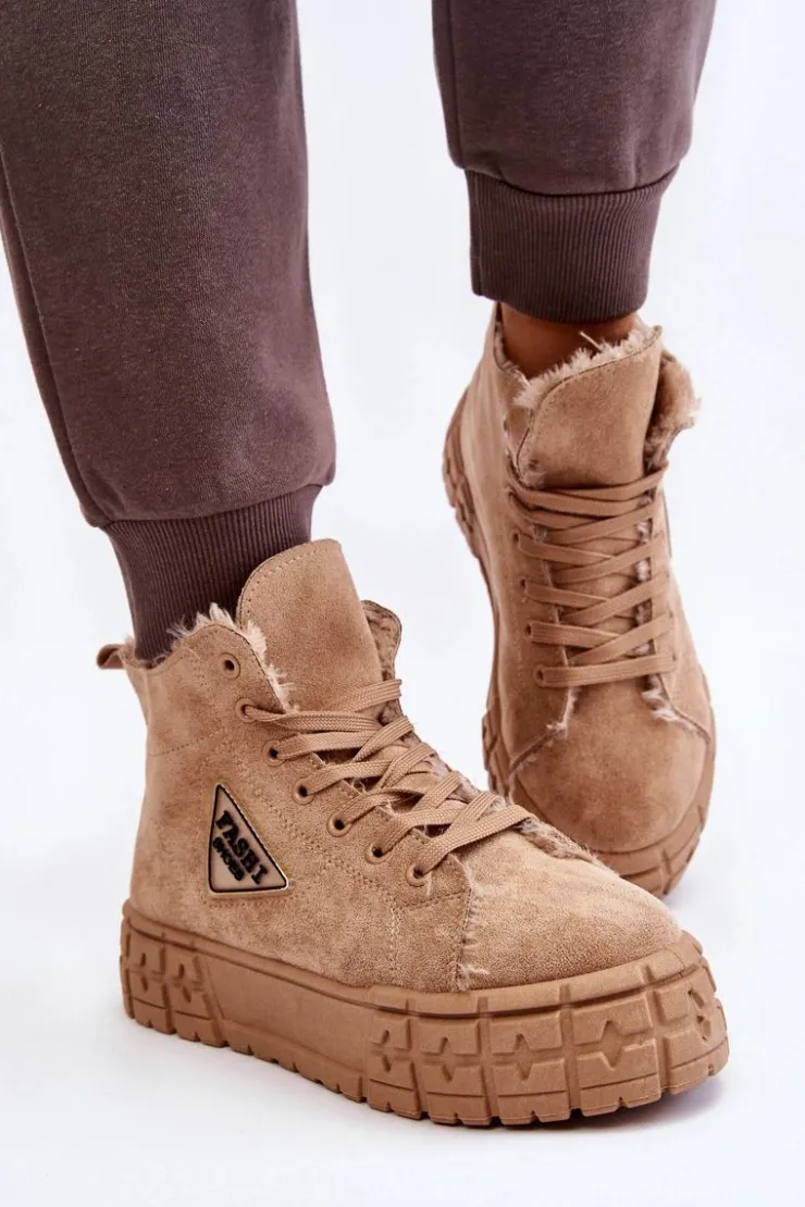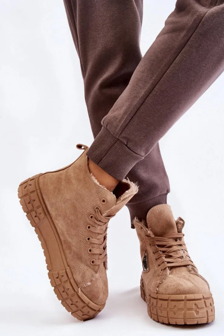 Modne trampki z cholewką wykonaną z eko zamszu. Posiadają wewnątrz ocieplenie w postaci futerka. Model klasycznie sznurowany. Trampki zostały osadzone na masywnej platformie, która delikatnie uniesie sylwetkę. Model ten świetnie sprawdzi się w chłodniejsze dni. Koniecznie powinnaś je mieć! Przy wyborze rozmiaru prosimy sugerować się tabelą rozmiarów.