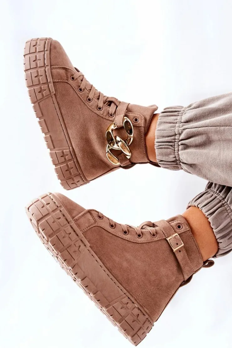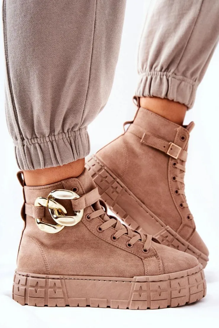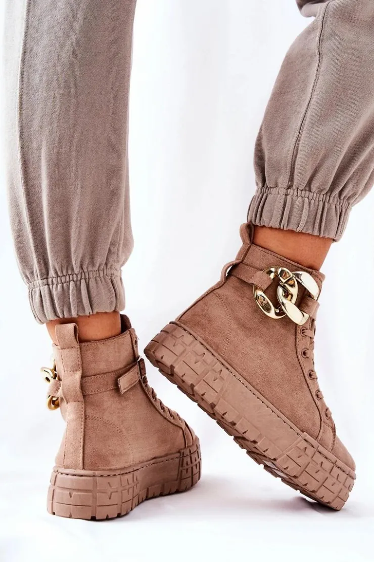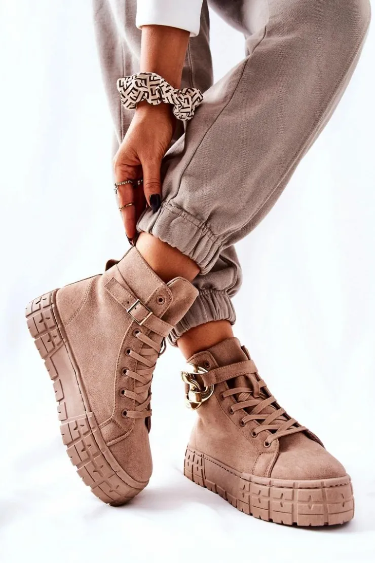 Buty zostały wykonane z zamszowej eko skóry. Wysokie trampki posiadają ozdobny łańcuch na pasku, który jest zapinany na sprzączkę. Można go także całkowicie zdjąć. Buty posiadają wysoką, stabilną platformę. Wśrodku znajduje się materiałowa wkładka. Koniecznie sprawdź także pozostałą naszą ofertę trampek na platformie! Przy wyborze rozmiaru prosimy sugerować się tabelą rozmiarów.
