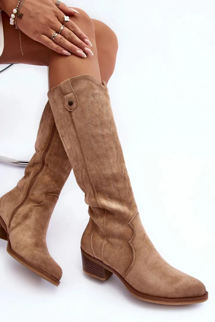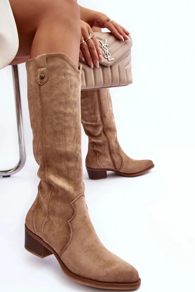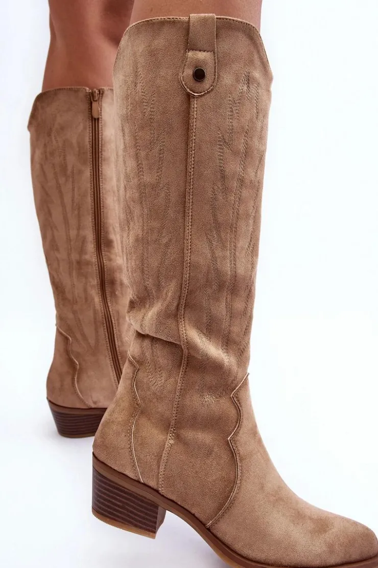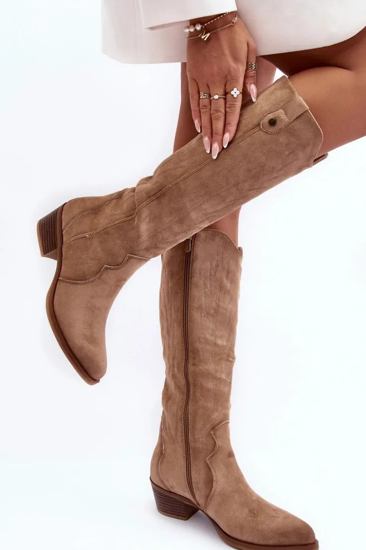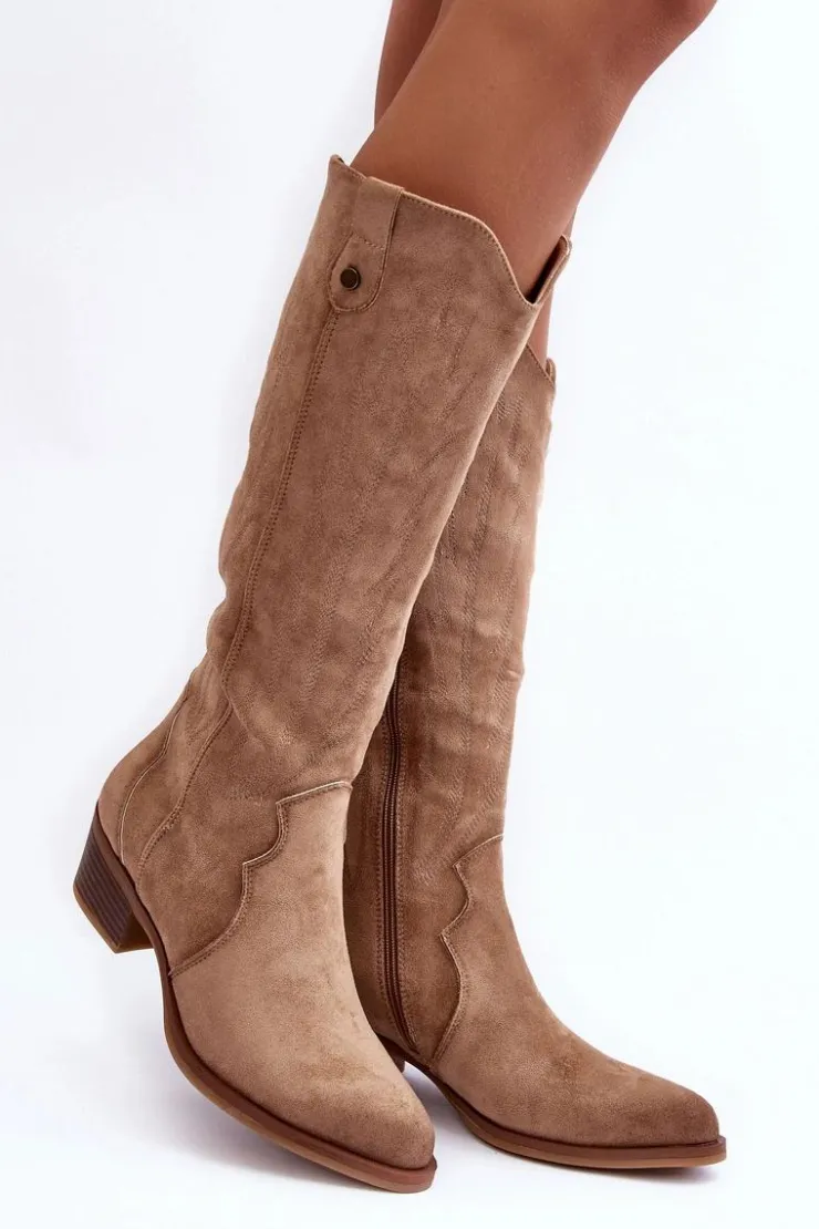 Ten model skradnie serce niejednej miłośniczce kozaków w stylu kowbojek! Świetnie sprawdzą się podczas jesiennych stylizacji! Model wykonany z miłego eko zamszu z delikatnymi przeszyciami na cholewce. Kozaki zapinane są na suwak. Osadzone na niskim, stabilnym obcasie. Ocieplone wewnątrz kocem obuwniczym. Nosek w szpic optycznie wysmukli nogi. Kozaki posiadają usztywniany zapiętek. Przy wyborze rozmiaru prosimy sugerować się tabelą rozmiarów.