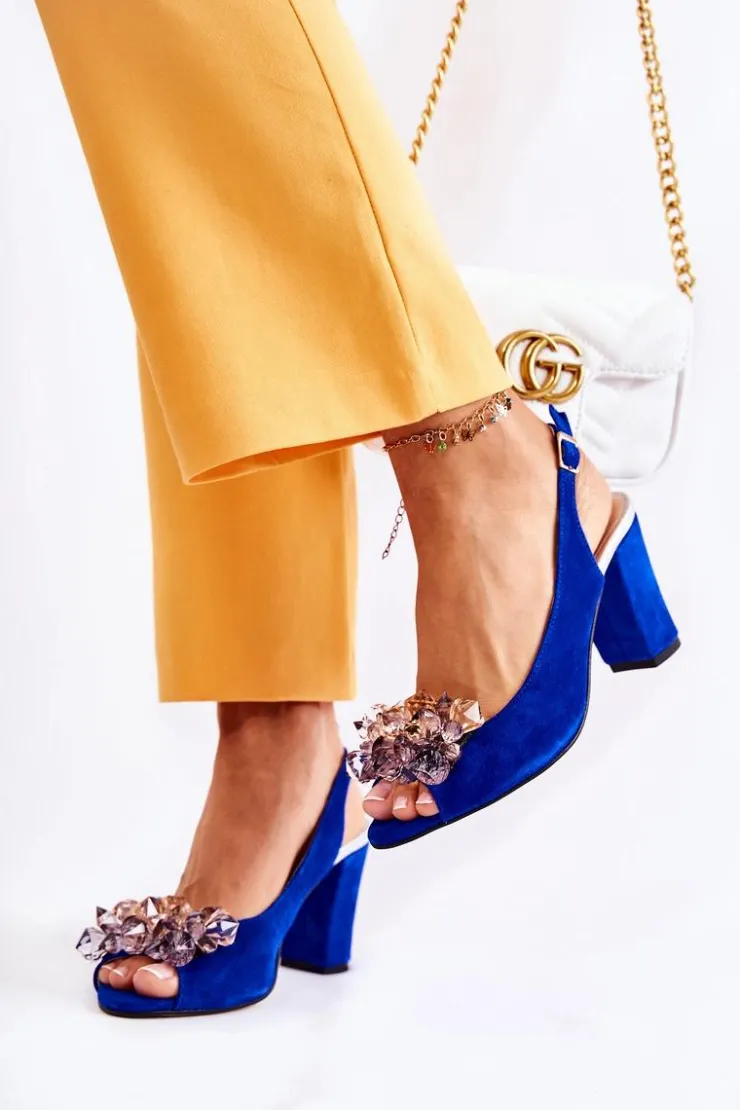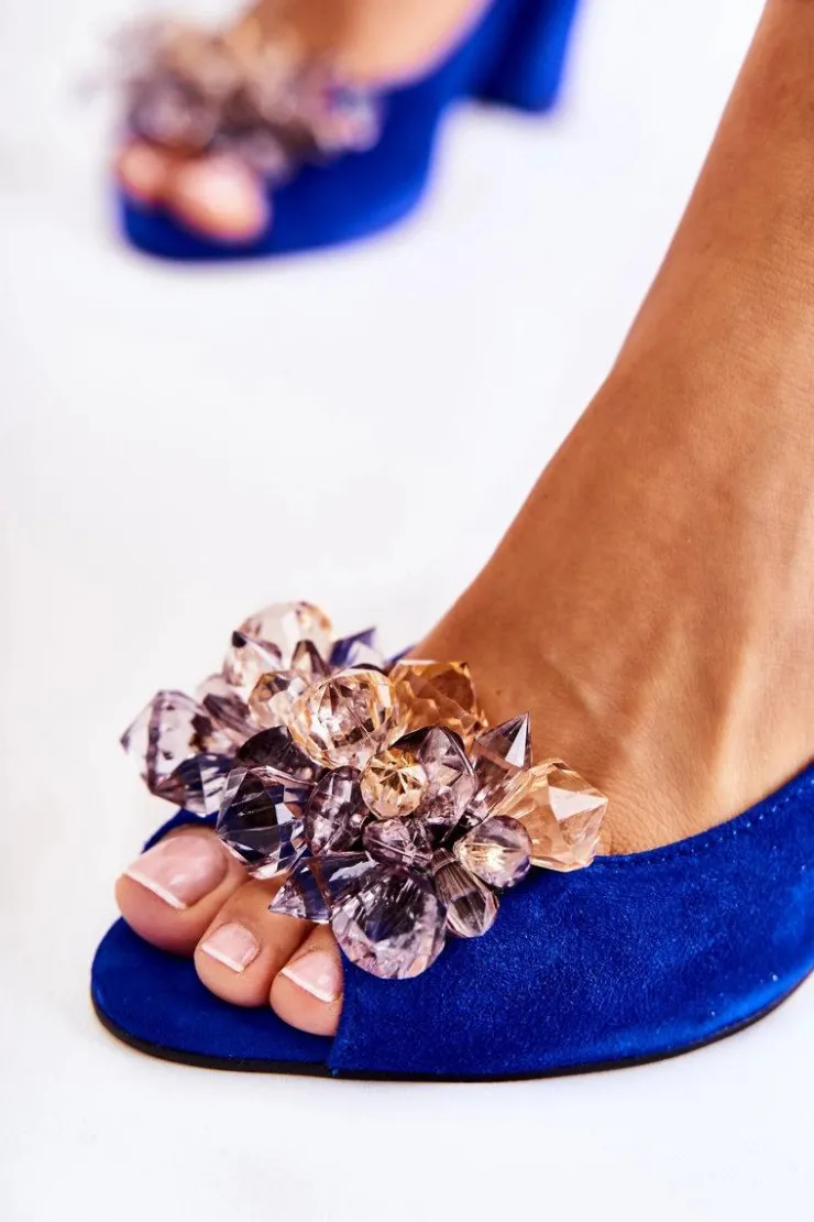Niezwykłe czółenka w formie sandałek zostały osadzone na obcasie w postaci słupka. Posiadają z przodu ozdoby imitujące kryształy. Miękka wkładka wykonana z połączenia skóry naturalnej oraz naturalnego zamszu zapewni komfort podczas użytkowania. Nosek odkryty, w kształcie migdała. Sandałki posiadają regulowany pasek zapinany wokół kostki na sprzączkę. Koniecznie powinnaś je mieć ten model w swojej garderobie! Przy wyborze rozmiaru prosimy sugerować się tabelą rozmiarów.