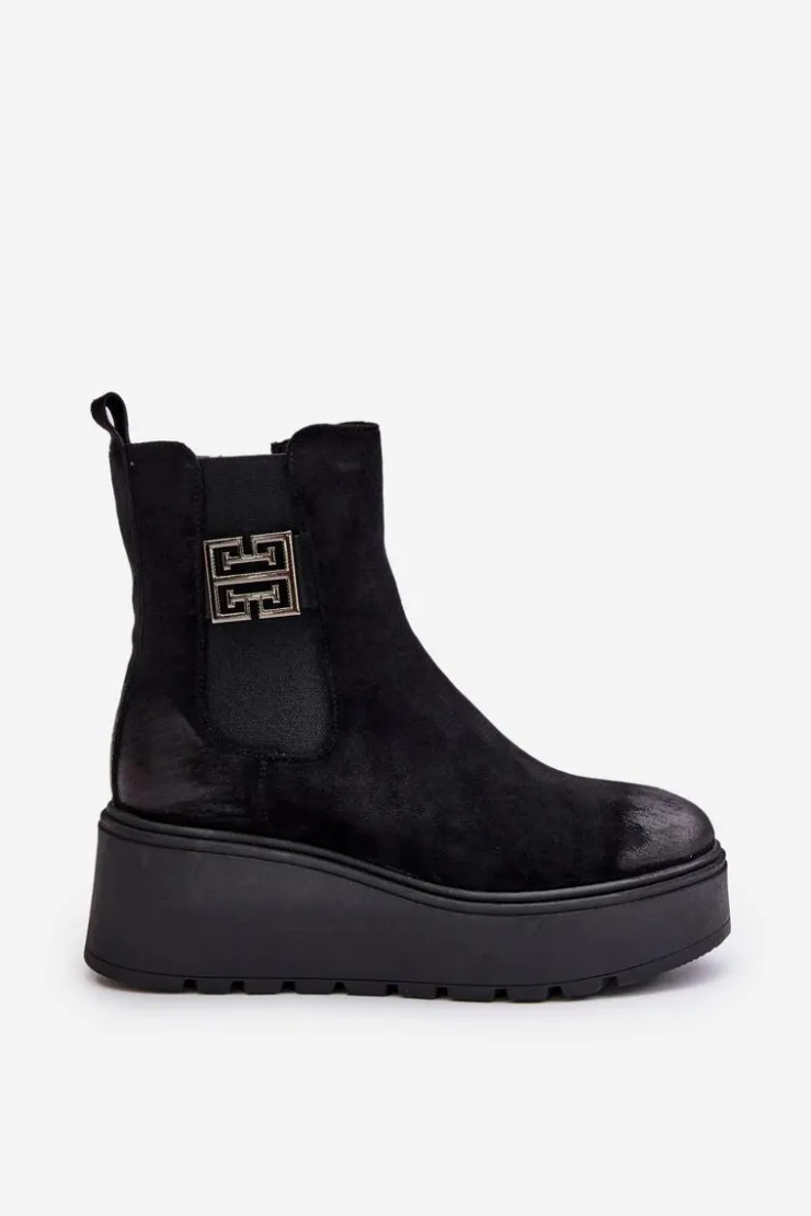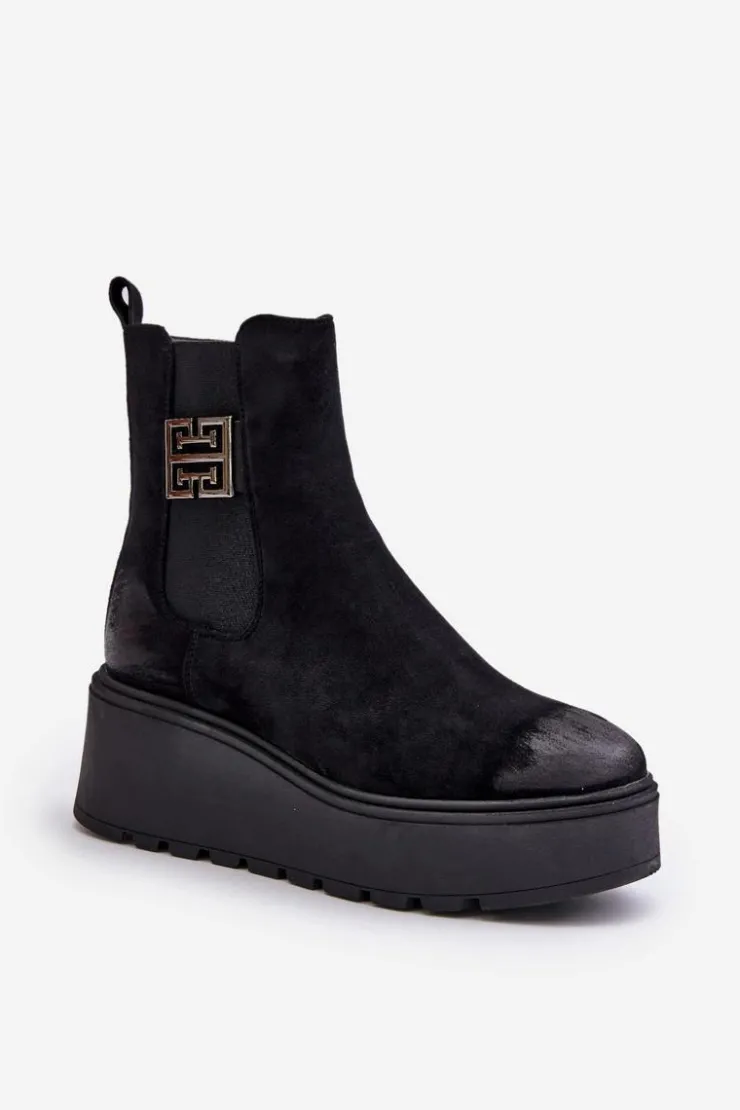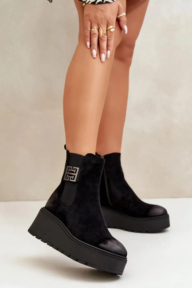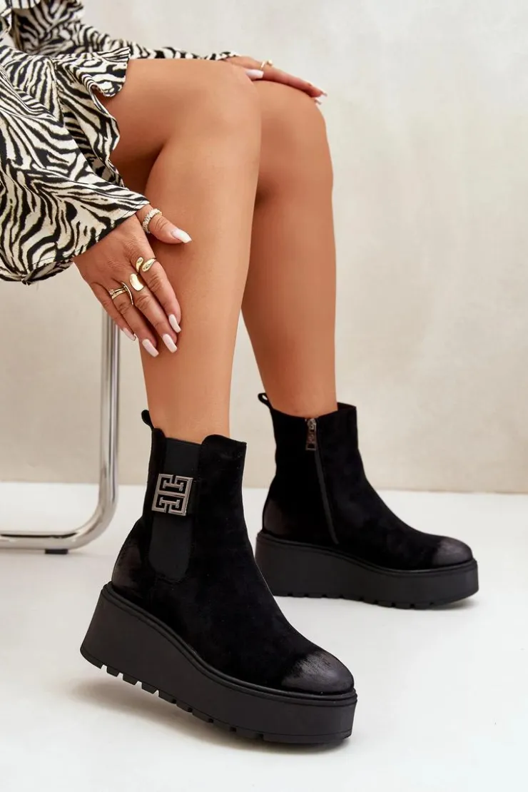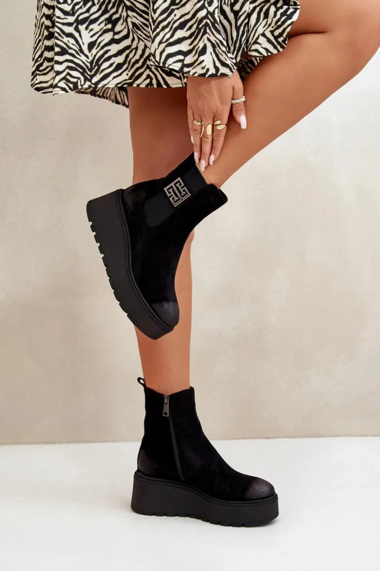 Botki wykonane z miękkiego eko zamszu, które idealnie łączą styl z komfortem. Osadzone na platformie i stabilnym koturnie, zapewniają wygodę noszenia przez cały dzień. Wnętrze ocieplone filcem. Zapinane na zamek, co ułatwia szybkie zakładanie i zdejmowanie. Noski zaokrąglone. Model ten doskonale uzupełni wiele różnych stylizacji, nadając im elegancji i komfortu. Przy wyborze rozmiaru prosimy kierować się tabelą rozmiarów