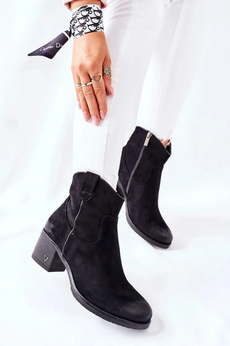 Cholewka wykonana jest z zamszowej skóry ekologicznej. Wnętrze botków pokryte zostało ciepłym kocem obuwniczym, który zagwarantuje ciepło. Zakładanie ułatwi wszyty z tyłu suwak. Przy wyborze rozmiaru prosimy sugerować się tabelą rozmiarów.