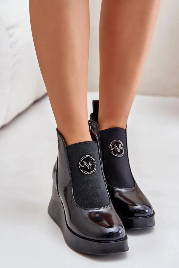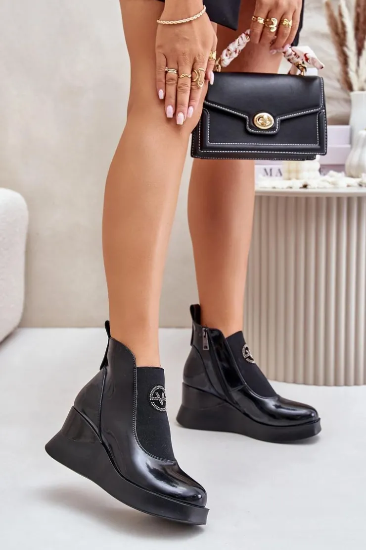 Botki damskie wykonane z naturalnej skóry. Osadzone na koturnie i platformie. Zapinane na suwak z boku. Na cholewce elastyczna wstawka oraz małe zdobienie. Noski zaokrąglone. Środek ocieplony kocem obuwniczym. Model ten to idealny wybór dla kobiet, które poszukują modnych, a zarazem wygodnych butów na co dzień! Przy wyborze rozmiaru prosimy sugerować się tabelą rozmiarów.