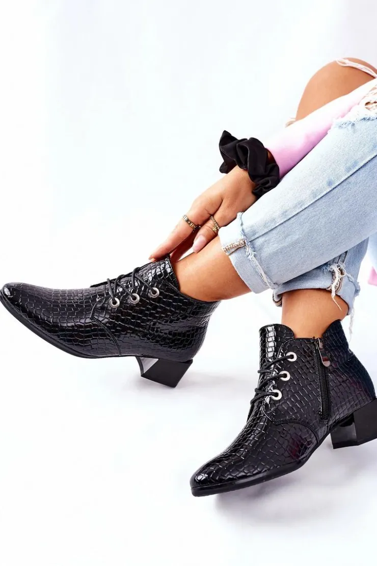 Damskie botki na obcasie. Zwierzęca faktura oraz lakierowanie sprawia, że wyglądało obłędnie. Ocieplenie w postaci koca obuwniczego.Przy wyborze rozmiaru prosimy sugerować się tabelą rozmiarów.