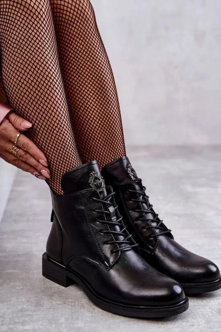 Botki damskie z cholewką wykonaną z eko skóry. Botki na języku zostały przyozdobione elementem z tworzywa sztucznego, który nadaje im niepowtarzalny wygląd. Model klasycznie sznurowany. Buty te zostały osadzone na płaskim obcasie. Środek ocieplony kocem obuwniczym sprawi, że chłodne dni nie będą już takie straszne! Ten model powinien być Twój! Przy wyborze rozmiaru prosimy sugerować się tabelą rozmiarów.