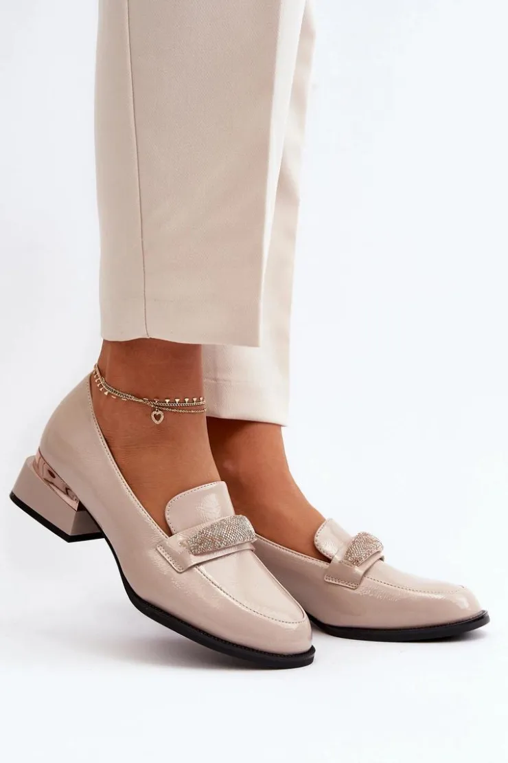 Eleganckie półbuty damskie osadzone na niskim obcasie z lustrzanym elementem. Wykonane z eko skóry. Noski zaokrąglone. Na przodzie ozdobny paseczek. Wkładka ze skóry naturalnej zapewni wygodę użytkowania. Idealne do wielu wiosennych stylizacji! Przy wyborze rozmiaru prosimy sugerować się tabelą rozmiarów.