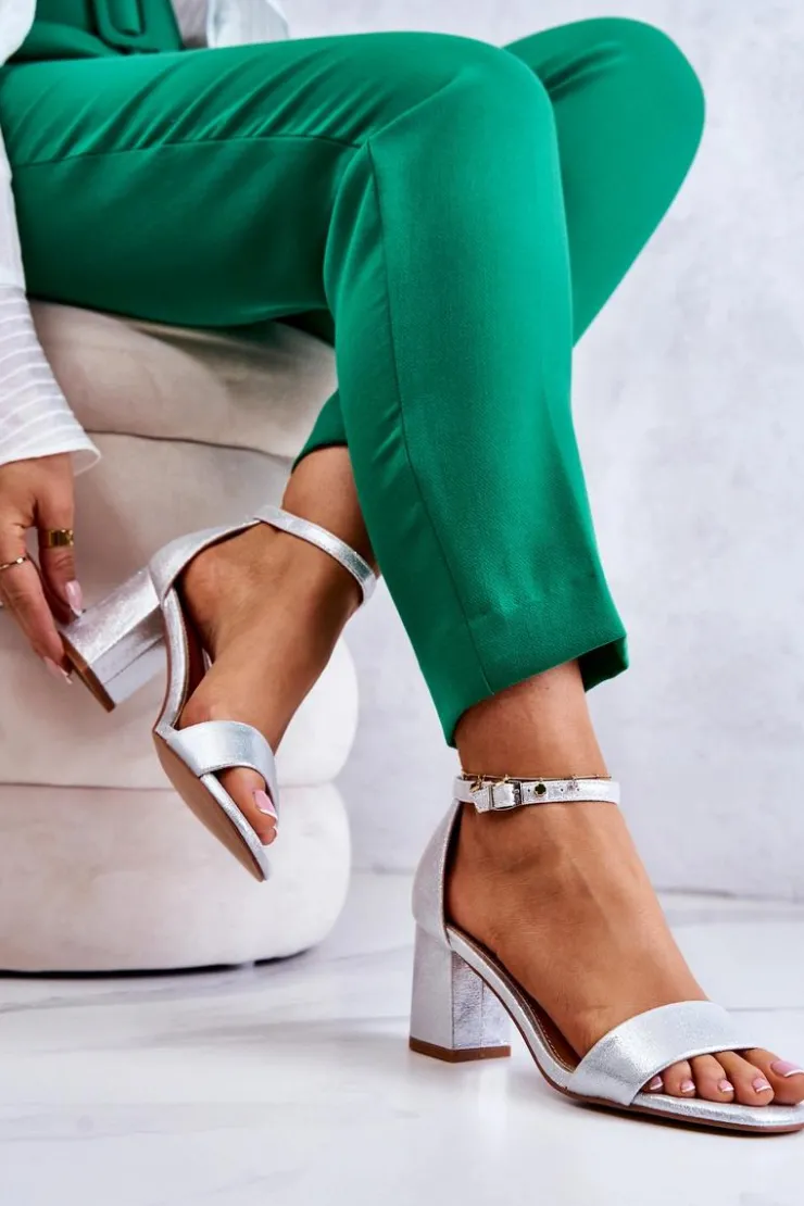 Piękne sandałki na obcasie zostały wykonane z błyszczącego materiału tekstylnego. Posiadają usztywniany zapiętek. Zapinane wokół kostki na regulowany pasek ze sprzączką. Miękka, eko skórzana wkładka zapewnia komfort podczas użytkowania. Stabilny obcas w postaci szerokiego słupka. Posiadają odkryty nosek i zakrytą piętę. Idealne na różnego rodzaju uroczystości. Świetnie będą prezentować się zarówno z eleganckimi sukniami, jak i spodniami. Przy wyborze rozmiaru prosimy sugerować się tabelą rozmiarów.
