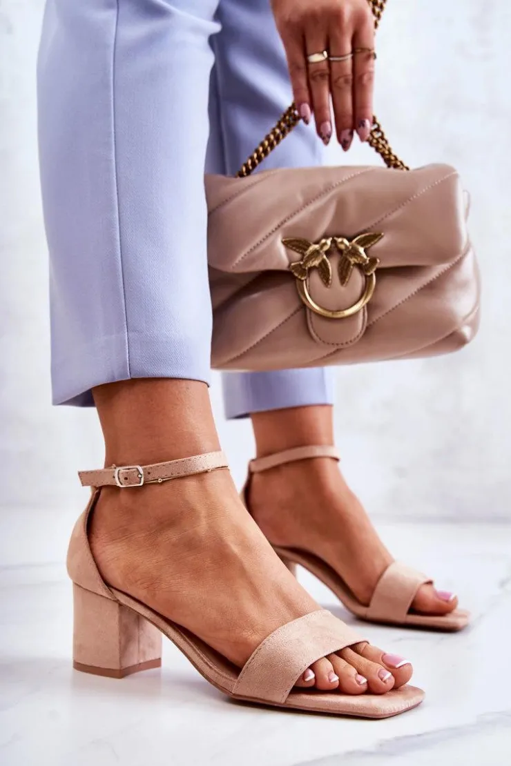 Piękne sandałki na niewysokim obcasie w postaci słupka. Wykonane z przyjemnego w dotyku eko zamszu. Wkładka wykonana z połączenia eko zamszu na przodzie oraz eko skóry. Nosek odkryty, kwadratowy. Sandały posiadają zakrytą piętę. Zapinane wokół kostki na regulowany pasek ze sprzączką. Wygodny model, idealny na wiele okazji! Buty świetnie będą pasować zarówno do sukienek, jak i eleganckich spodni. Na pewno wykorzystasz je w wielu sytuacjach! Przy wyborze rozmiaru prosimy sugerować się tabelą rozmiarów.