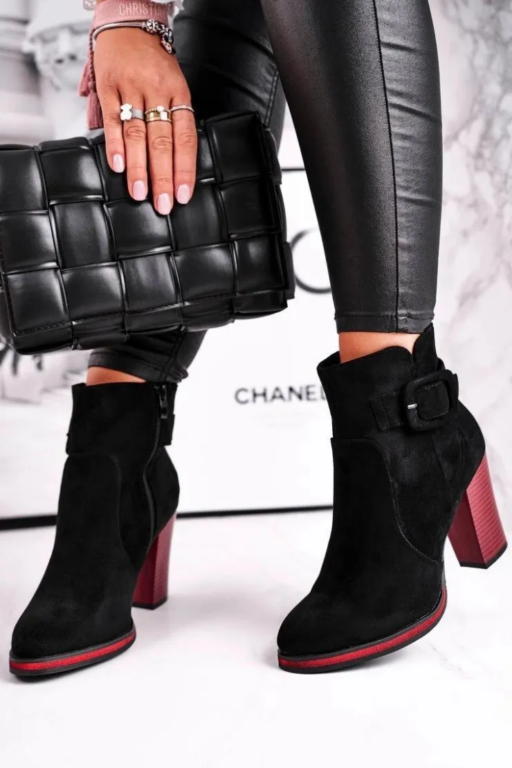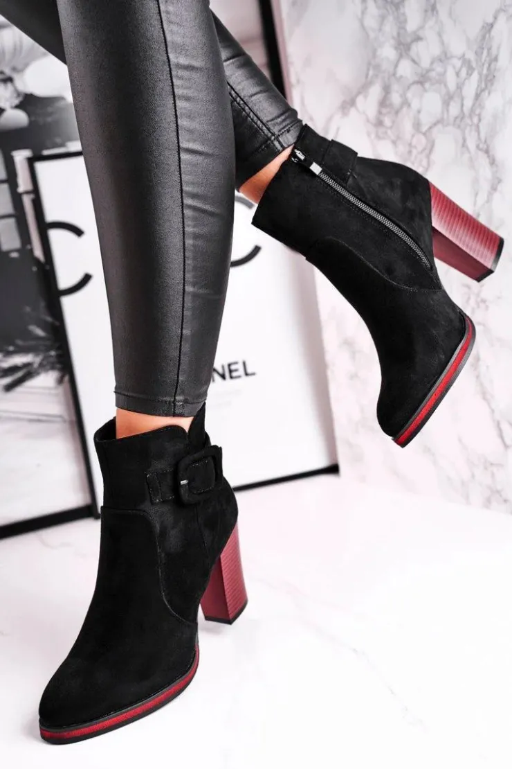 Przepiękne, modne i nietuzinkowe. Takie są właśnie botki od Sergio Leone. Najnowszy model został wykonany ze skóry ekologicznej imitującej zamsz. Przepiękny fason w połączeniu z czerwonym słupkiem wygląda niesamowicie. Botki zapinane na suwak. Na zewnętrznej stronie znajduje się ozdobna klamra. Przy wyborze rozmiaru prosimy sugerować się tabelą rozmiarów.