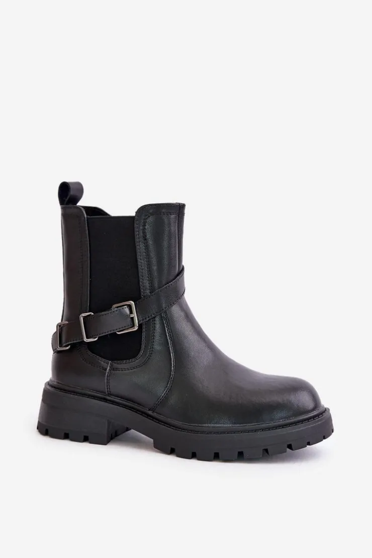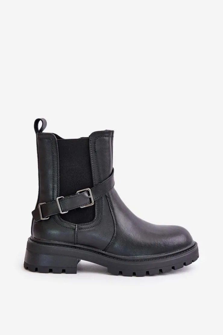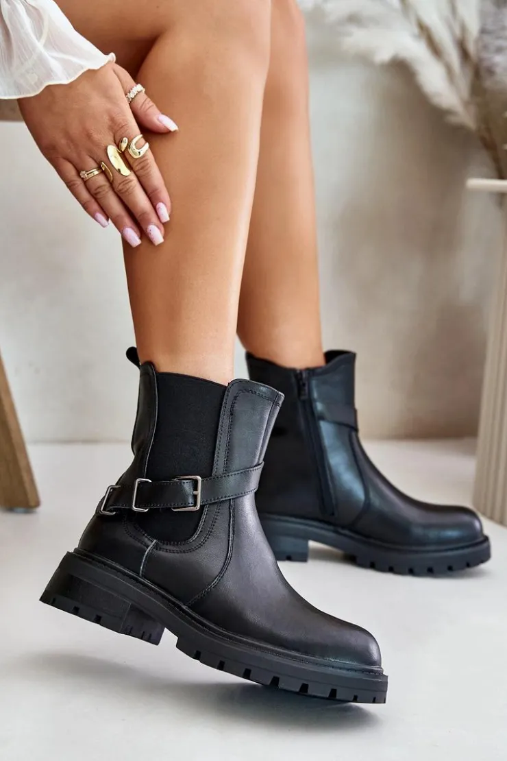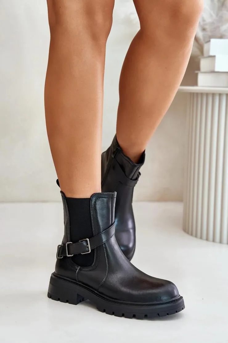 Buty Sergio Leone Botki Ocieplane|Botki Zimowe Damskie*Skórzane Ocieplane Botki Sztyblety Z Paskiem Sergio Leone TR719-S Czarne Czarny
