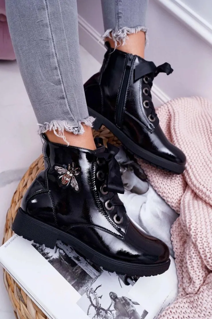 Buty Sergio Leone Botki Sznurowane|Botki Zimowe Damskie*Botki Damskie Płaski Obcas Glany Lakierowane Czarne Sergio Leone BT530