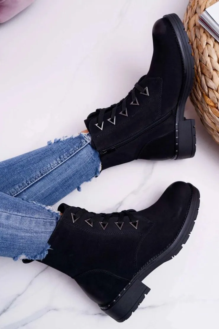 Buty Sergio Leone Botki Sznurowane|Botki Zimowe Damskie*Botki Damskie Płaski Obcas Nubuk Czarne Sergio Leone TR718