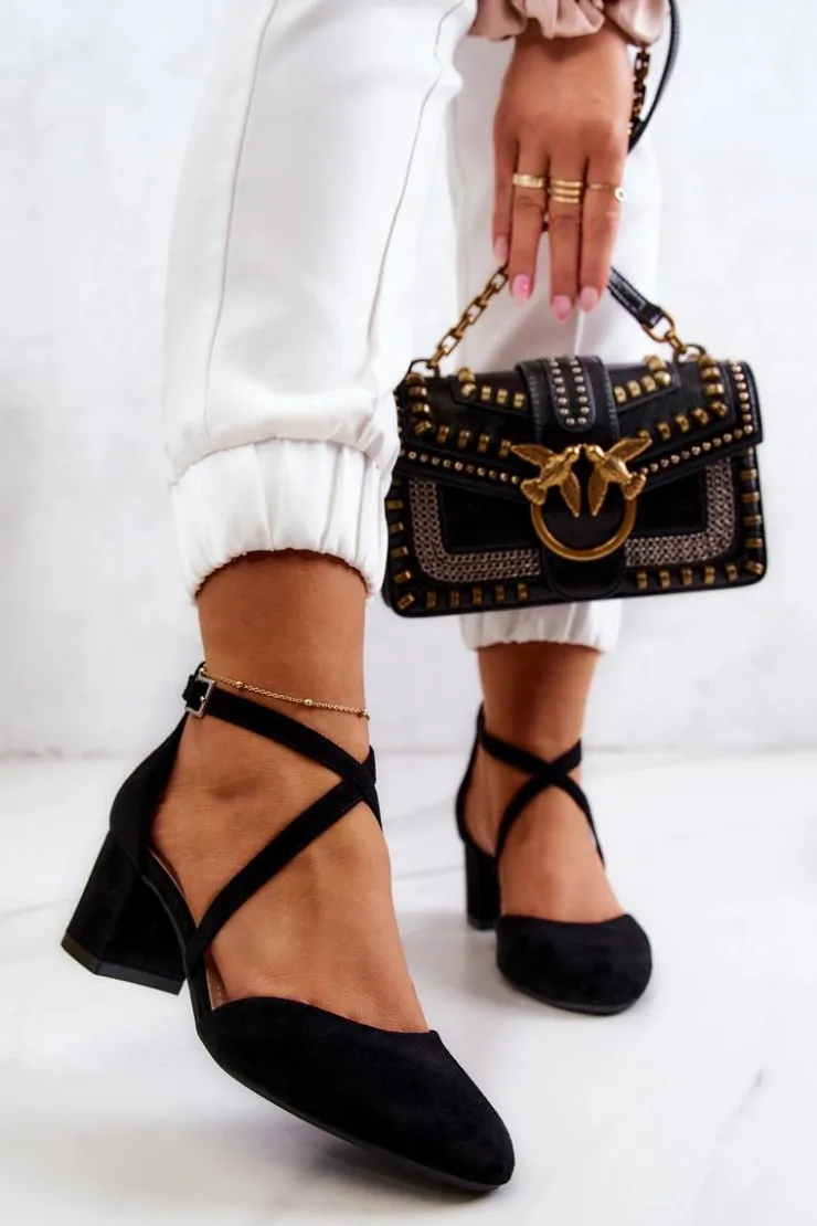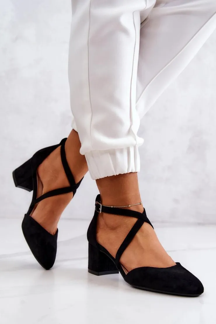 Czółenka na niskim, stabilnym słupku. Zakryte na palcach oraz pięcie. Zapinane na regulowany pasek na sprzączkę znajdującą się na wysokości kostki. Model z zaokrąglonym noskiem. Wykonane z zamszowej eko skóry. Wkładka wykonana z naturalnej skóry. Idealne do sukienek oraz eleganckich kombinezonów. Świetnie sprawdzą się podczas wielu uroczystości. Przy wyborze rozmiaru prosimy sugerować się tabelą rozmiarów.