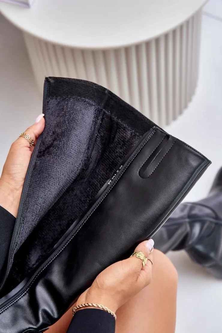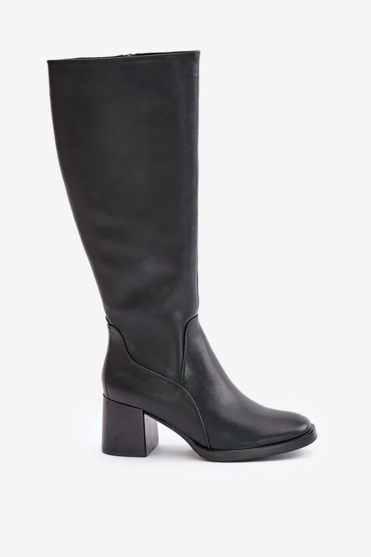 Eleganckie skórzane kozaki przed kolano to doskonała propozycja na chłodniejsze dni. Wykonane z wysokiej jakości skóry, ocieplane wnętrze zapewnia ciepło i komfort. Model zapinany na zamek dla wygody zakładania, a stabilny obcas typu słupek dodaje stylowego podkreślenia sylwetki. Zaokrąglone noski. Model ten idealnie pasuje do eleganckich stylizacji. Przy wyborze rozmiaru prosimy sugerować się tabelą rozmiarów.