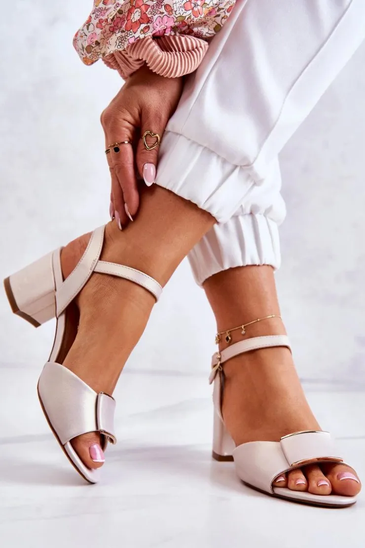 Sandały z cienkim, regulowanym paskiem zapinanym na niewielką, metalową sprzączkę. Osadzone na niewysokim obcasie typu słupek. Wykonane z eko skóry z piękną ozdobą z przodu. Nosek odkryty. Wyposażone w wkładkę ze skóry naturalnej, która jest bardzo miękka i wygodna. Możesz założyć je do wielu stylizacji – do pracy, na spotkania biznesowe czy na randkę. Skomponuj je z wzorzystą sukienką czy szerokimi, eleganckimi spodniami. Przy wyborze rozmiaru prosimy sugerować się tabelą rozmiarów.