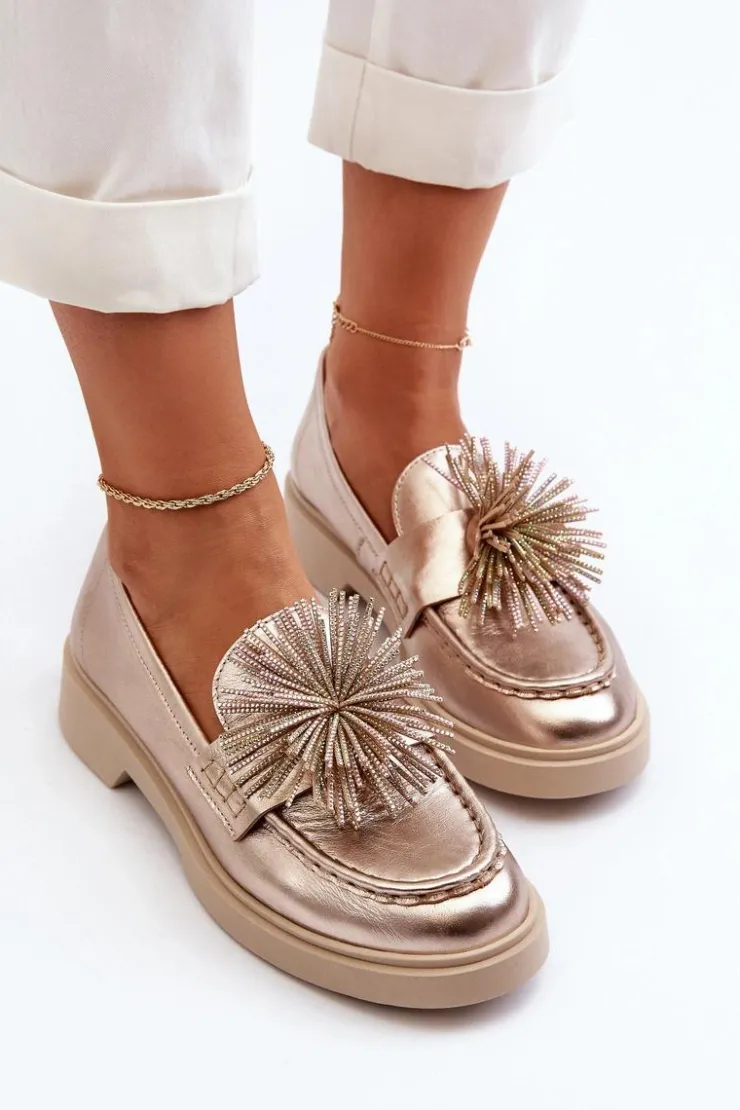 Piękne damskie mokasyny wykonano z wysokiej jakości skóry naturalnej, gwarantując trwałość i komfort noszenia. Ich płaski, masywny obcas zapewnia stabilność i wygodę. Skórzana wkładka dodatkowo podnosi komfort noszenia, zapewniając miękkość i wsparcie dla stóp. Ozdoba na pasku nadaje subtelny, elegancki akcent, który doskonale uzupełnia codzienne stylizacje, sprawiając, że są one nie tylko wygodne, ale także stylowe i uniwersalne. Przy wyborze rozmiaru prosimy sugerować się tabelą rozmiarów.
