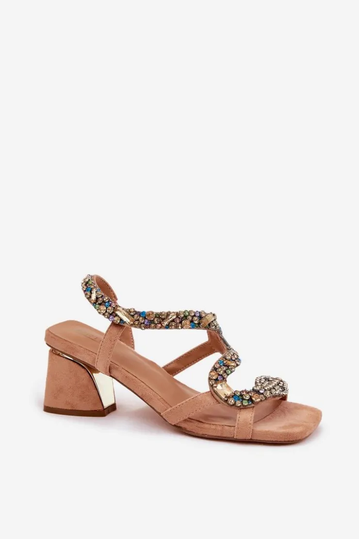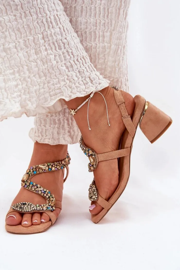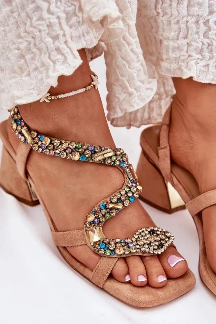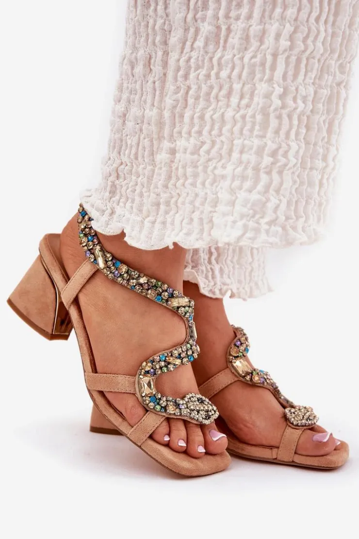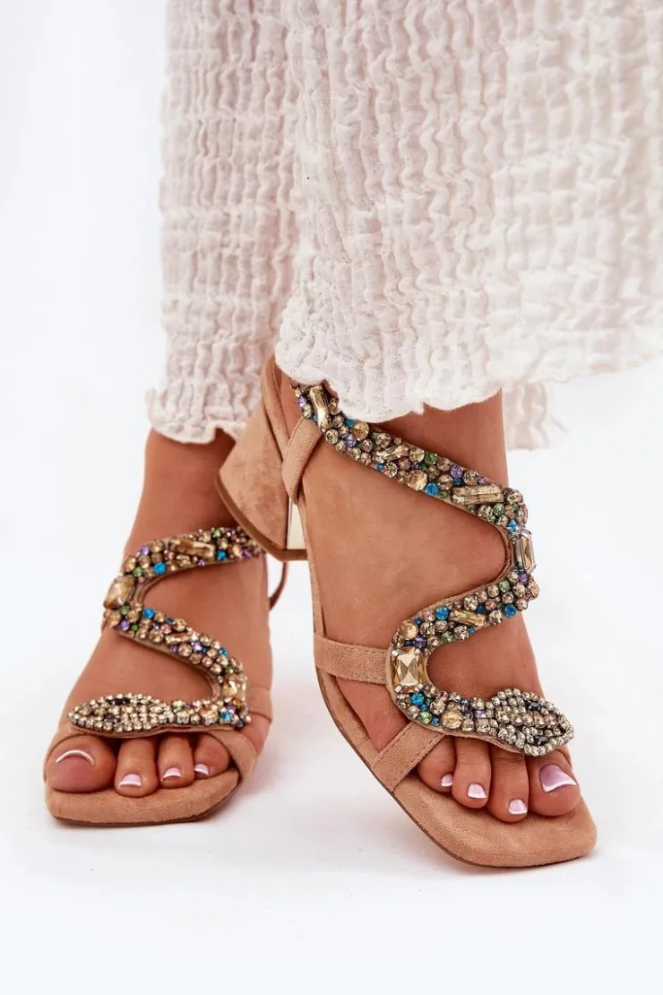 Eleganckie sandały damskie z eko zamszu to wyjątkowy wybór na specjalne okazje. Osadzone na słupkowym obcasie z lustrzanym elementem. Model wyróżnia się efektownym zdobieniem z kryształków, które tworzą unikalny wzór węża, przyciągając wzrok i nadając wyjątkowego charakteru. Idealne na wieczorne wyjścia, te sandały będą doskonałym uzupełnieniem stylizacji na różne uroczystości, łącząc modny design z eleganckim wykończeniem. Przy wyborze rozmiaru prosimy sugerować się tabelą rozmiarów.