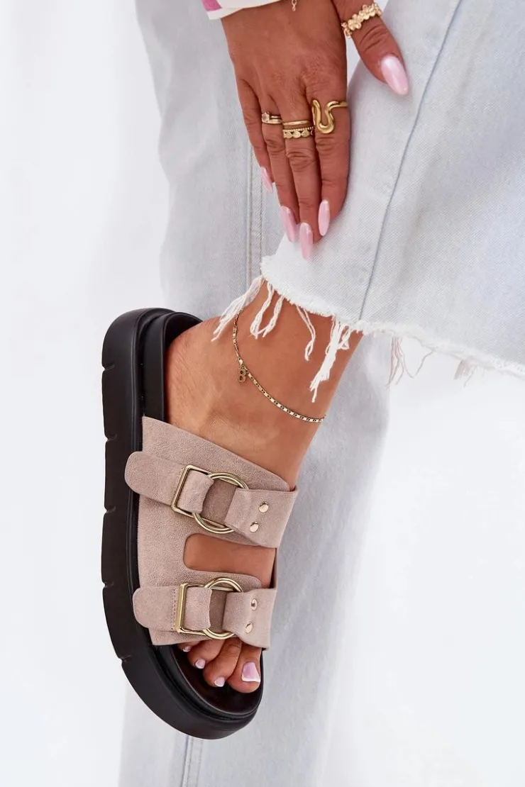 Damskie klapki marki Big Star, wykonane z wysokiej jakości naturalnego zamszu, to doskonała propozycja na ciepłe dni. Osadzone na platformie, zapewniają komfort i stabilność przez cały dzień. Model ten wyróżnia się dwoma paskami ozdobionymi klamrami, które nadają im nowoczesnego charakteru. Stylowe i eleganckie, te klapki będą doskonałym uzupełnieniem letnich stylizacji, łącząc wygodę z modnym wyglądem. Przy wyborze rozmiaru prosimy sugerować się tabelą rozmiarów.