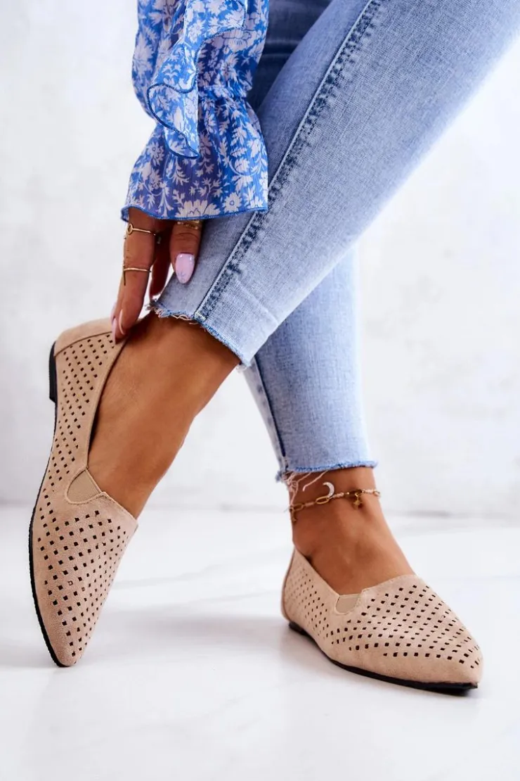 Niezwykłe baleriny dla niezwykłych kobiet! Ażurowy wzór to idealny wybór na wiosenno-letni sezon! Wykonane z eko zamszu. Wkładka wykonana z eko skóry. Model wsuwany. Nosek w szpic. Bardzo wygodne i stylowe, z pewnością spodobają się wszystkim dookoła! Podeszwa wykonana z tworzywa sztucznego. Osadzone na podeszwie z płaskim obcasem. Zapiętek usztywniany. Będą pasować zarówno do casualowych, jak i tych eleganckich stylizacji. Koniecznie te baleriny powinny znaleźć się w Twojej szafie! Przy wyborze rozmiaru prosimy sugerować się tabelą rozmiarów.
