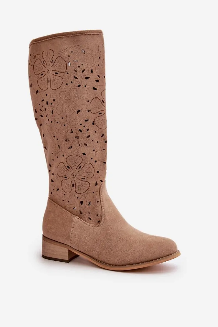 Kozaki damskie wykonane z wysokiej jakości eko zamszu. Cholewka sięga przed kolano, a jej ażurowy wzór dodaje wyjątkowego charakteru. Zapinane na zamek, co ułatwia zakładanie i zdejmowanie. Osadzone na niskim obcasie, który gwarantuje komfort noszenia przez cały dzień. Noski są zaokrąglone. Usztywniony zapiętek zapewnia dodatkowe wsparcie i stabilność. Te kozaki doskonale sprawdzą się zarówno w casualowych, jak i bardziej eleganckich stylizacjach. Przy wyborze rozmiaru prosimy kierować tabelą rozmiarów.