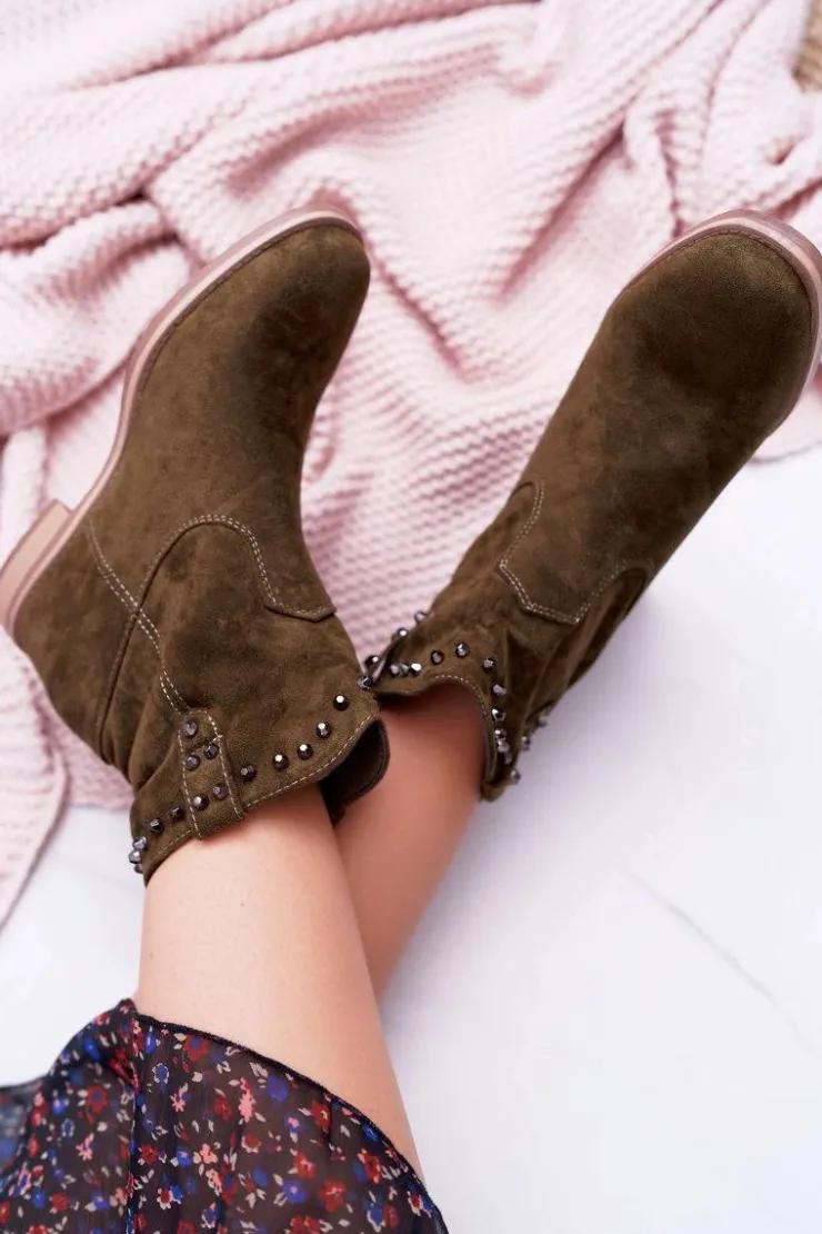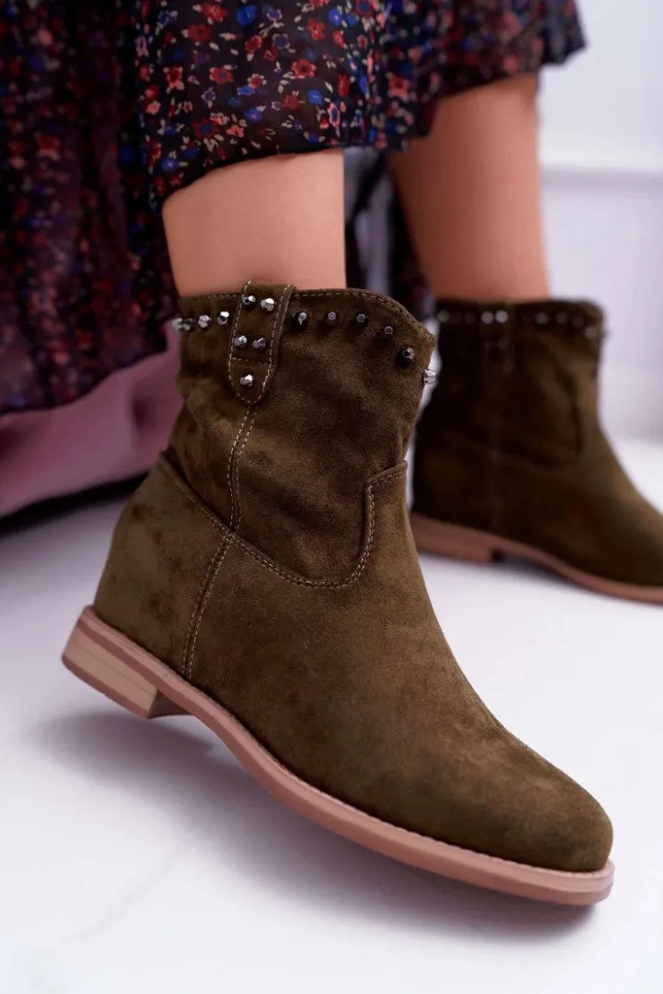 Clearance Boto Botki Damskie Na Koturnie Płaski Obcas Ocieplane Za Kostkę Oliwkowe Deminis