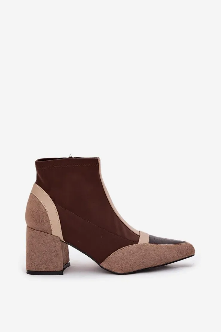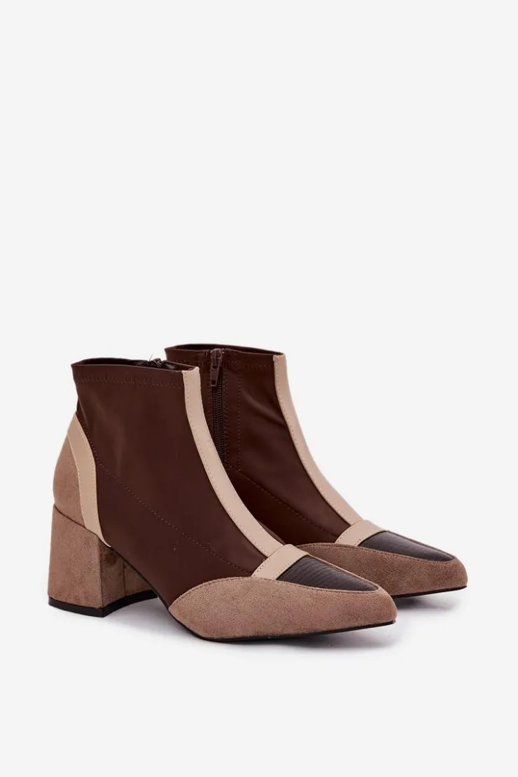 Botki damskie wykonane z połączenia materiału tekstylnego i eko zamszu to propozycja, która łączy oryginalny design z elegancją. Kontrastowe wstawki dodają całości modnego charakteru i sprawiają, że buty prezentują się wyjątkowo stylowo. Smukłe, szpiczaste noski optycznie wysmuklają stopę, podkreślając kobiecy wygląd i nadając sylwetce lekkości. Model osadzony jest na masywnym obcasie typu słupek, który zapewnia stabilność i wygodę podczas noszenia, a jednocześnie pięknie podkreśla linię nóg. Botki zapinane są na praktyczny zamek, co ułatwia zakładanie i zdejmowanie obuwia. To idealny wybór dla kobiet, które chcą połączyć komfort z nowoczesnym stylem – świetnie sprawdzą się zarówno w eleganckich stylizacjach, jak i w codziennych zestawach. Przy wyborze rozmiaru prosimy sugerować się tabelą rozmiarów.