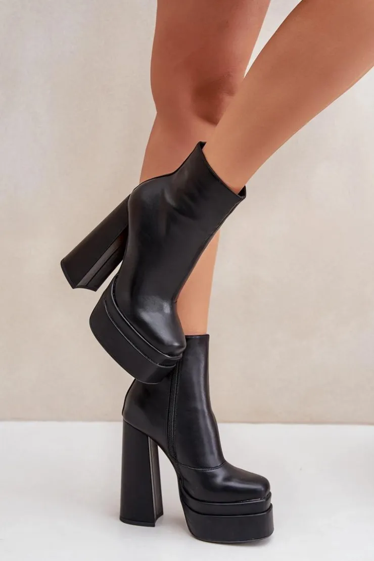 Botki damskie wykonane z eko skóry, osadzone na masywnej platformie i wysokim obcasie, które dodają charakteru każdej stylizacji. Model z zaokrąglonymi noskami zapewnia komfort noszenia. Wnętrze ocieplane kocem obuwniczym, idealne na chłodniejsze dni. Praktyczne zapięcie na zamek ułatwia zakładanie. Stylowe i wygodne, doskonałe na co dzień i specjalne okazje. Przy wyborze rozmiaru prosimy sugerować się tabelą rozmiarów.
