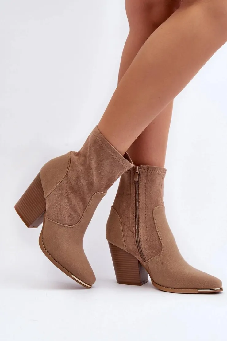 Botki damskie wykonane z eko zamszu. Osadzone na obcasie w postaci słupka. Zapinane na zamek. Cholewka za kostkę. Noski w migdał optycznie wysmuklą nogi. Model ten posiada lekkie ocieplenie kocem obuwniczym na wysokości stopy. Przy wyborze rozmiaru prosimy sugerować się tabelą rozmiarów.