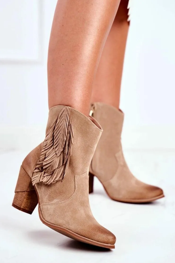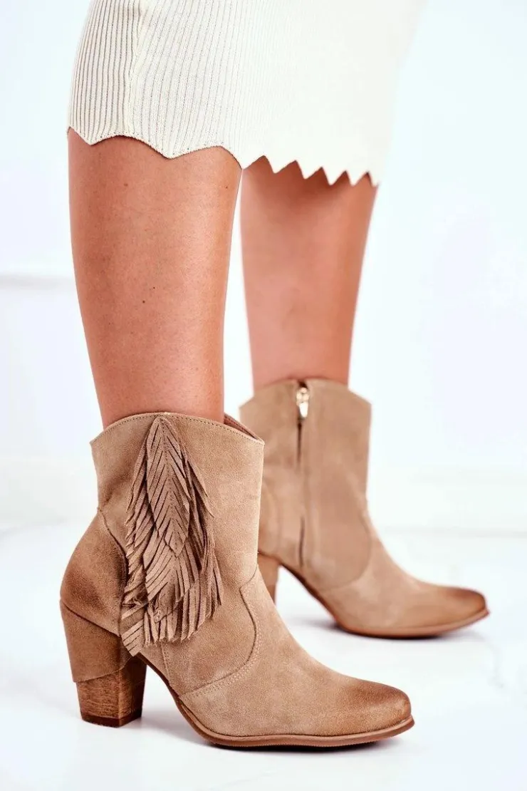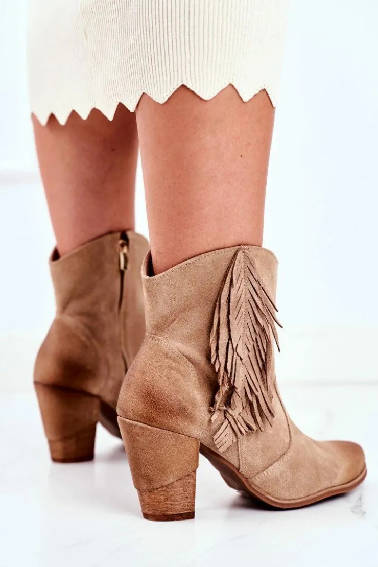 Lubisz ekskluzywne kolekcje butów w najwyższej jakości wykonania i użytych materiałów? Dobrze trafiłaś! To właśnie buty z tej kategorii! Botki zostały wykonane w całości ze skóry naturalnej, która w niezwykle delikatny sposób otuli Twoją stopę luksusem. Obuwie zostało ozdobione frędzelkami, tworzącymi motyw trzech nakładających się na siebie liści po zewnętrznej stronie kostki. Wszelkie przeszycia zostały wykonane z najwyższym kunsztem i dbałością o szczegóły. Szeroki obcas w formie słupka pozwoli Ci na stabilne poruszanie się nawet po śliskich powierzchniach.Ta zgrabna forma idealnie wysmukli Twoją nogę, a Ty poczujesz się jeszcze piękniejsza! O ile to możliwe:) Przy wyborze rozmiaru prosimy sugerować się tabelą rozmiarów.