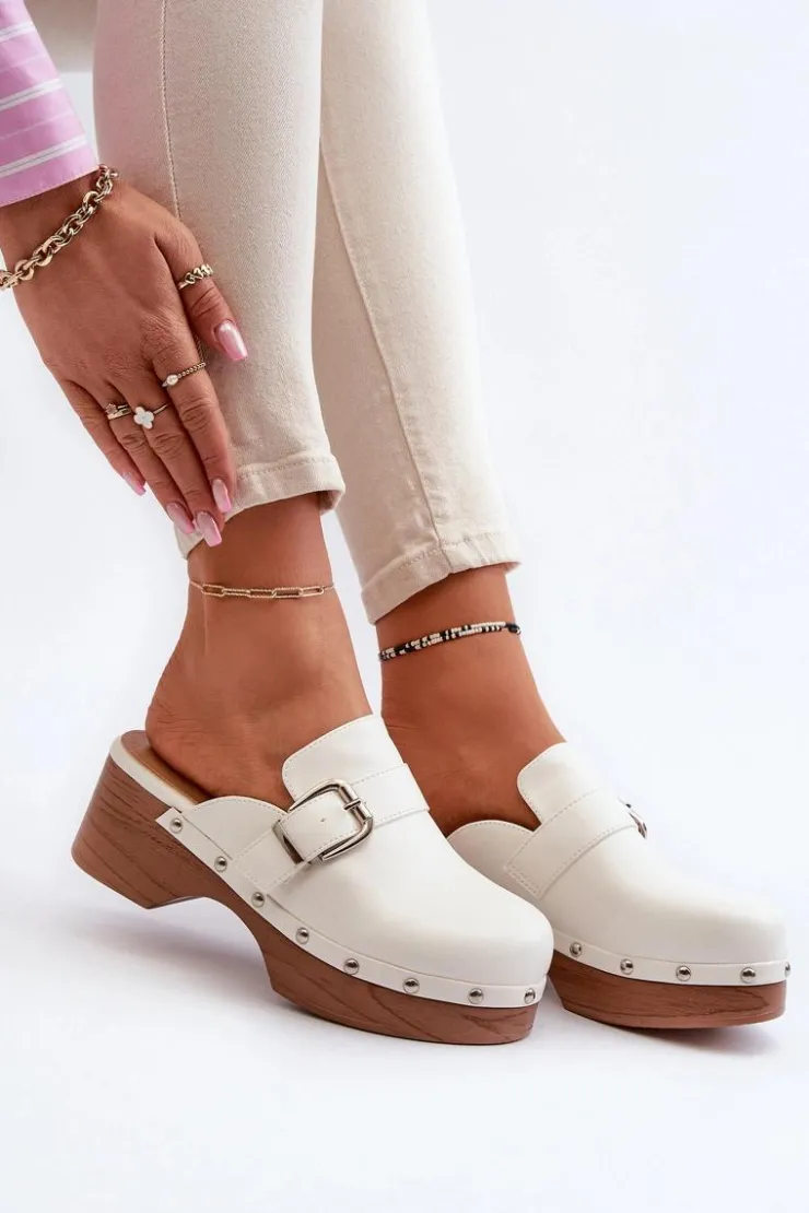Lekkie klapki osadzone na obcasie i platformie, co nadaje im subtelny wyraz. Na cholewce pasek z klamrą oraz ozdobne ćwieki wokół podeszwy. Wykonane z eko skóry, zarówno cholewka, jak i wkładka gwarantują trwałość i komfort noszenia. Ten model świetnie komponuje się z codziennymi stylizacjami, dodając im nuty szyku i wyrafinowania. Przy wyborze rozmiaru prosimy sugerować się tabelą rozmiarów.