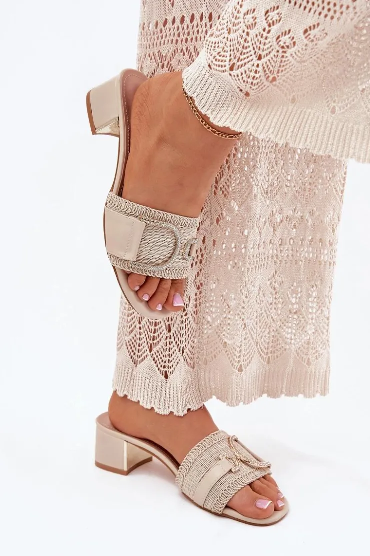 Klapki damskie na obcasie typu klocek to elegancka propozycja na ciepłe dni. Z przodu znajdują się subtelne ozdobne detale z cyrkoniami, które nadają im wyjątkowego blasku. Eko skórzana wkładka zapewnia komfort przez cały dzień. Idealne do letnich stylizacji, łączą wygodę z modnym wyglądem, doskonale sprawdzają się zarówno na co dzień, jak i na specjalne wyjścia. Przy wyborze rozmiaru prosimy kierować się tabelą rozmiarów.