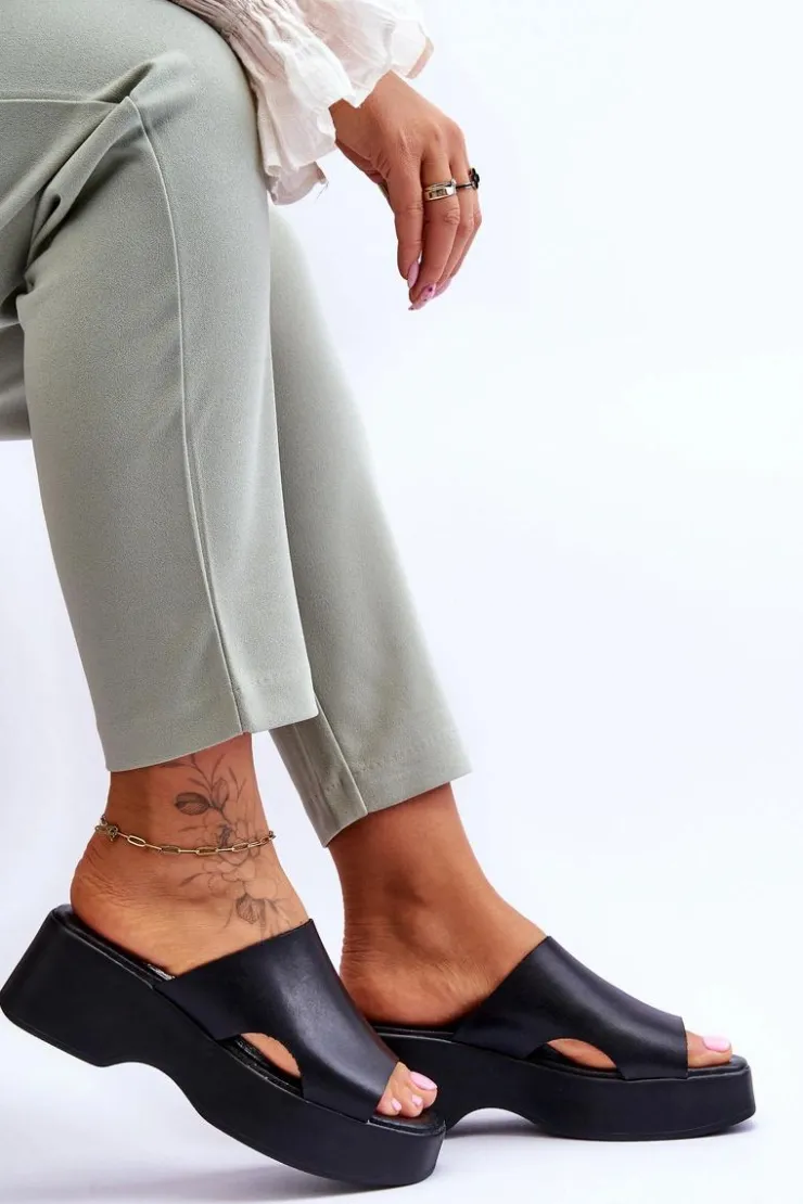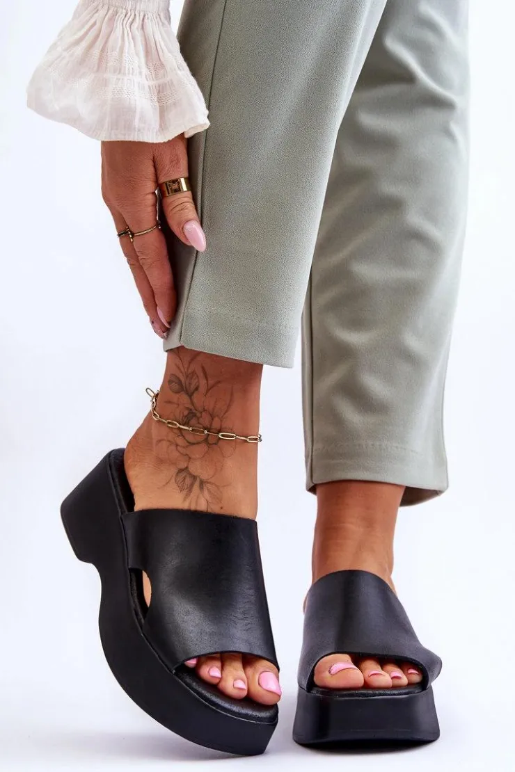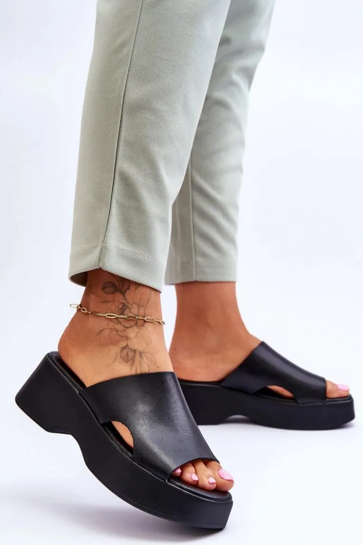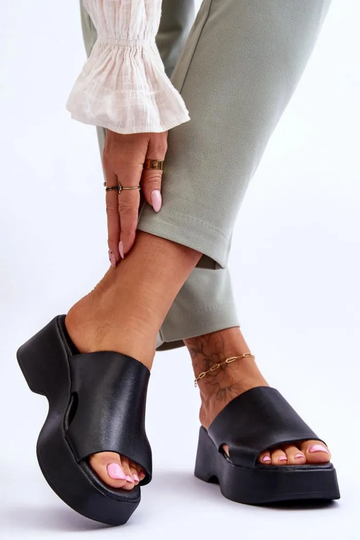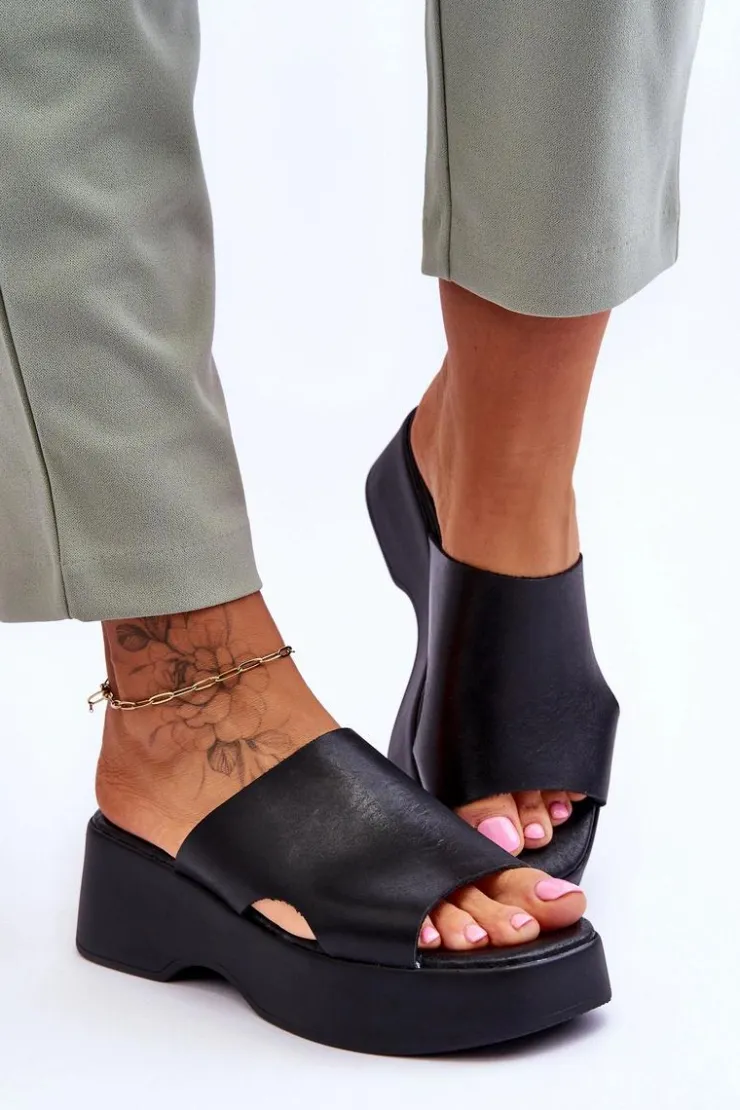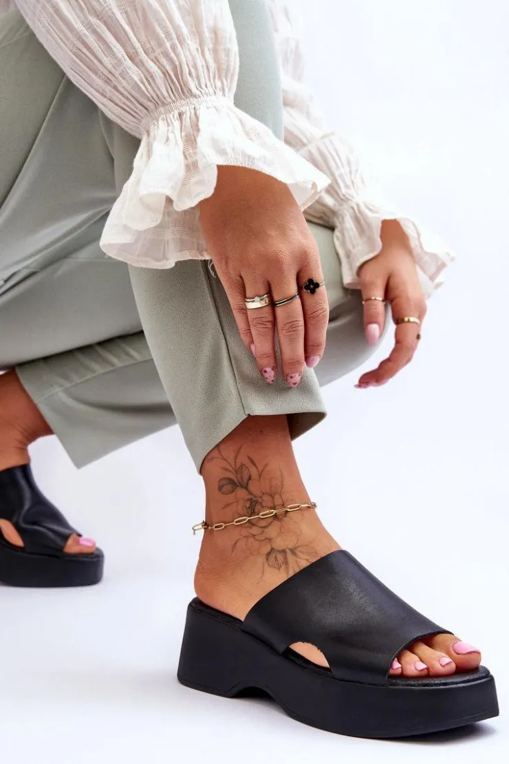 Damskie, klasyczne klapki zostały wykonane z naturalnej skóry z wycięciami. Osadzone na płaskim obcasie z ozdobioną podeszwą. Model ten z pewnością przypadnie do gustu każdej kobiecie ceniącej sobie styl oraz wygodę. Miękka, skórzana wkładka pozwoli na komfortowe użytkowanie obuwia nawet przez cały dzień. Przy wyborze rozmiaru prosimy sugerować się tabelą rozmiarów.