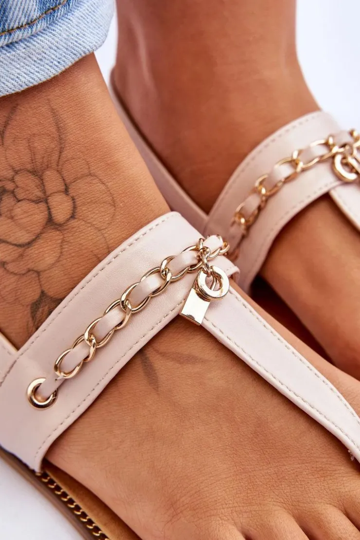 Sandały o fasonie japonek to idealny wybór na cieplejsze dni! Zostały wykonane z eko skóry. Posiadają zdobienie w postaci łańcuszka oraz kłódki. Zapinane wokół kostki na regulowany pasek ze sprzączką. Dodatkowo na podeszwie przy wkładce znajdują się zdobienia. Sandałki osadzono na płaskim obcasie i gumowej podeszwie. Komfortowa w użytkowaniu wkładka została wykonana z eko skóry. Przy wyborze rozmiaru prosimy kierować się tabelą rozmiarów.