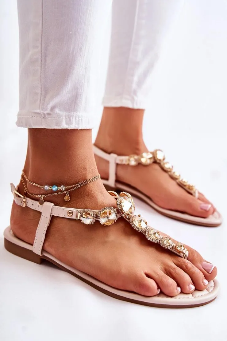 Modne sandały – japonki zostały wykonane z eko skóry. Buty te są niezwykle przewiewne. Cienkie paski zostały przyozdobione dżetami w postaci mieniących się kryształów oraz cyrkonii. Model zapinany na sprzączkę z regulowanym paskiem, dzięki któremu możesz je odpowiednio dopasować do tęgości nogi. Miękka wkładka jest dodatkowo pikowana. Sandały świetnie będą prezentować się z wieloma stylizacjami! Przy wyborze rozmiaru prosimy kierować się tabelą rozmiarów.