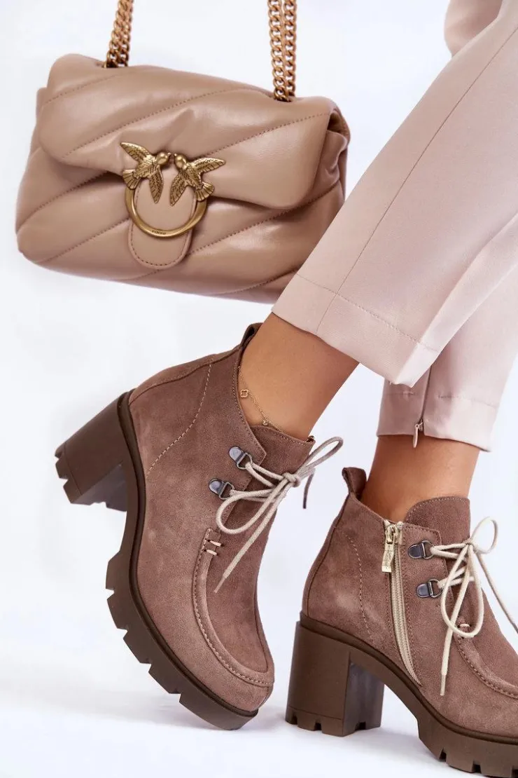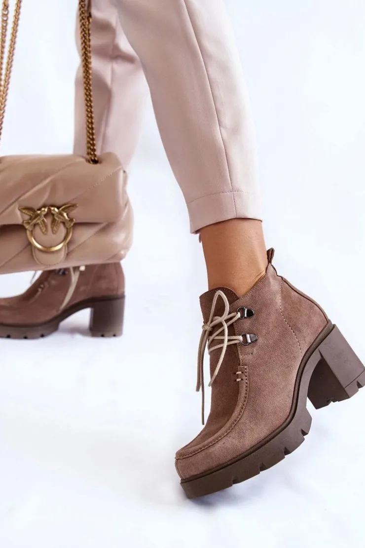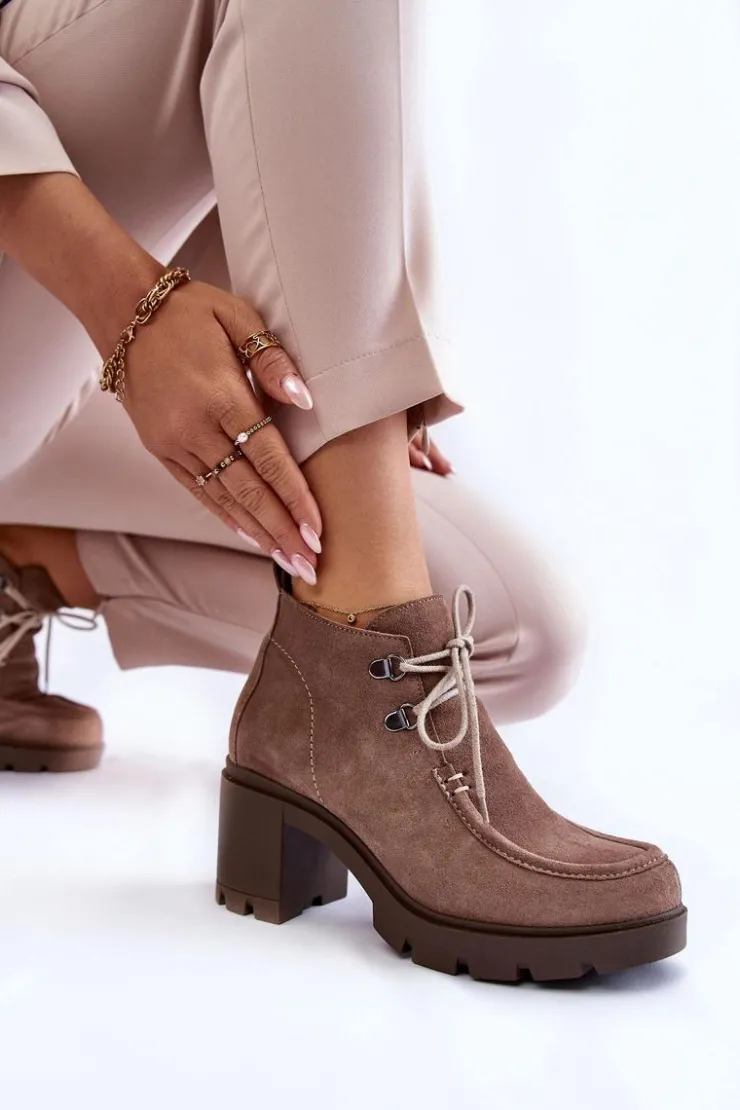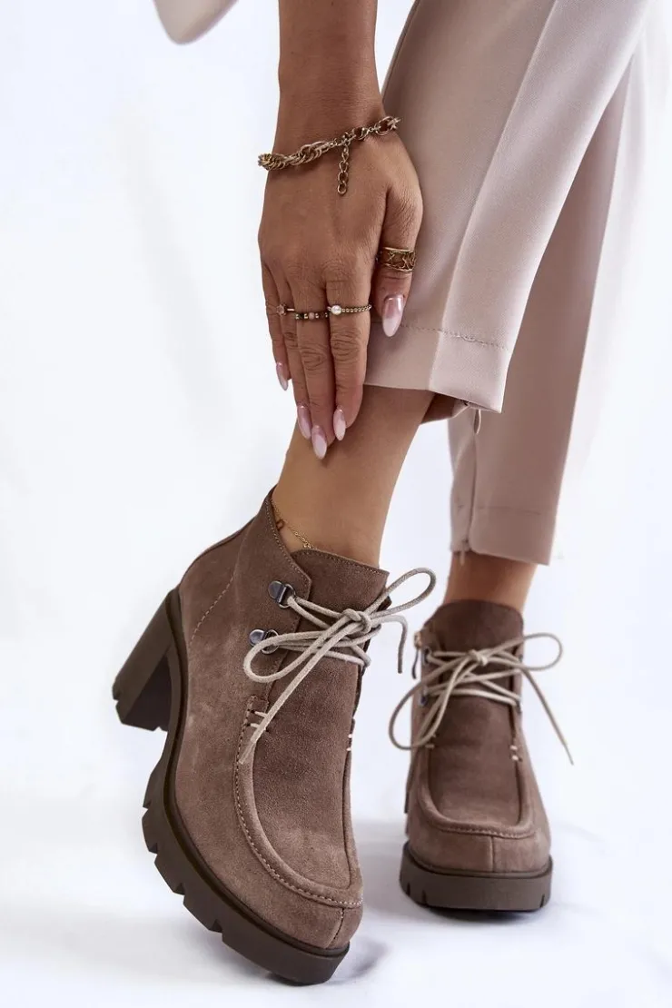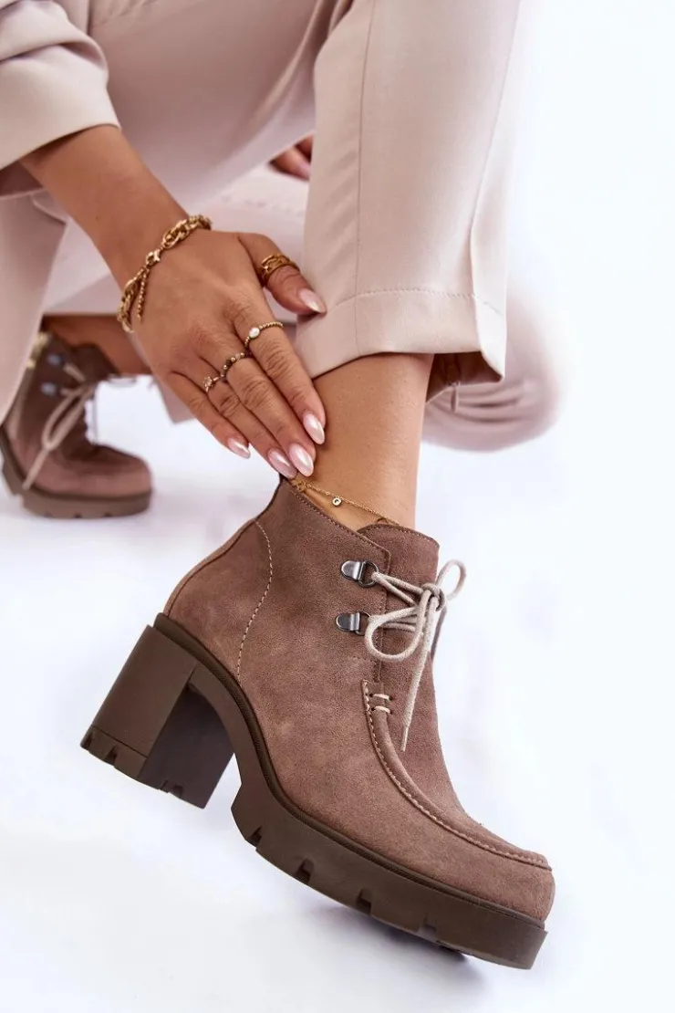 Botki o fasonie trzewików posiadające cholewkę sięgającą powyżej kostki. Gruby, stabilny obcas oraz okrągły nosek. Wiązane na cienkie, okrągłe sznurówki w dopasowanym do obuwia kolorze. Wykonane ze skóry naturalnej. Całość tworzy niebanalny charakter. Botki są ocieplane kocem obuwniczym, z usztywnianym zapiętkiem. Posiadają suwak z boku cholewki ułatwiający zakładanie obuwia. Idealne do wielu stylizacji! Przy wyborze rozmiaru prosimy sugerować się tabelą rozmiarów.