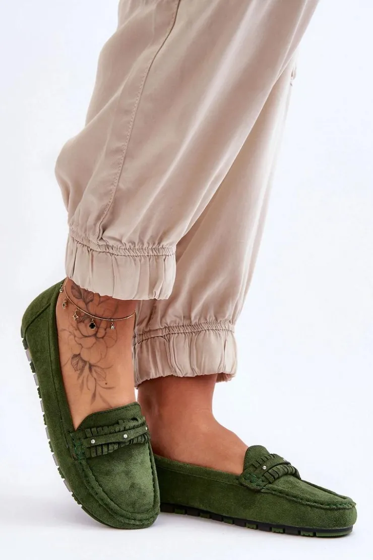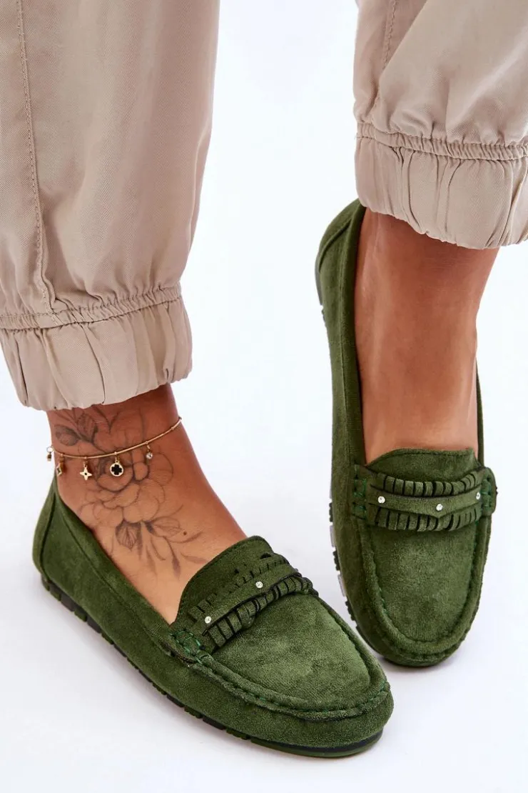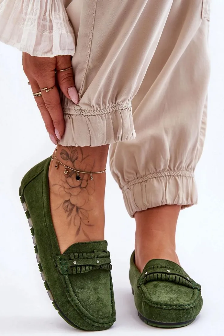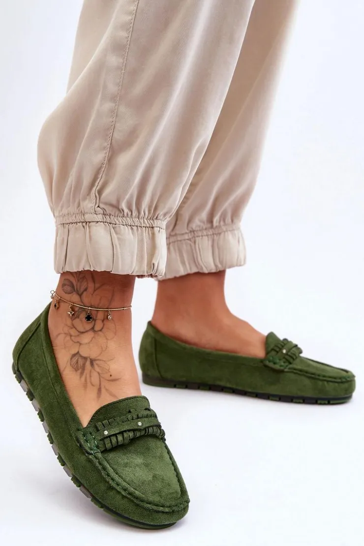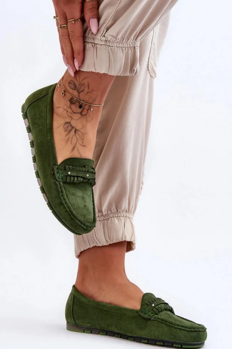 Idealne na wiele okazji klasyczne mokasyny damskie zostały wykonane z eko zamszu. Model ten posiada na przodzie ozdobny paseczek z ćwiekami. Mokasyny osadzono na niskiej platformie. Miękka wkładka z eko skóry zapewni komfort podczas użytkowania obuwia. Model ten posiada kwadratowy nosek. Przy wyborze rozmiaru prosimy sugerować się tabelą rozmiarów.