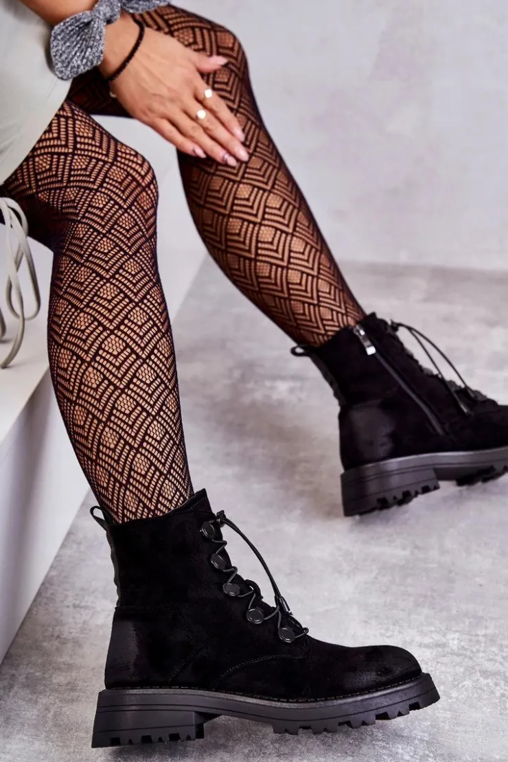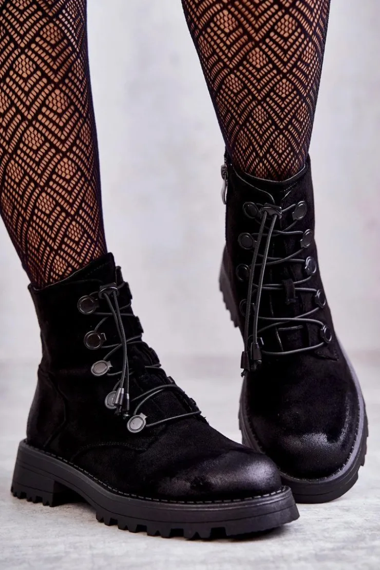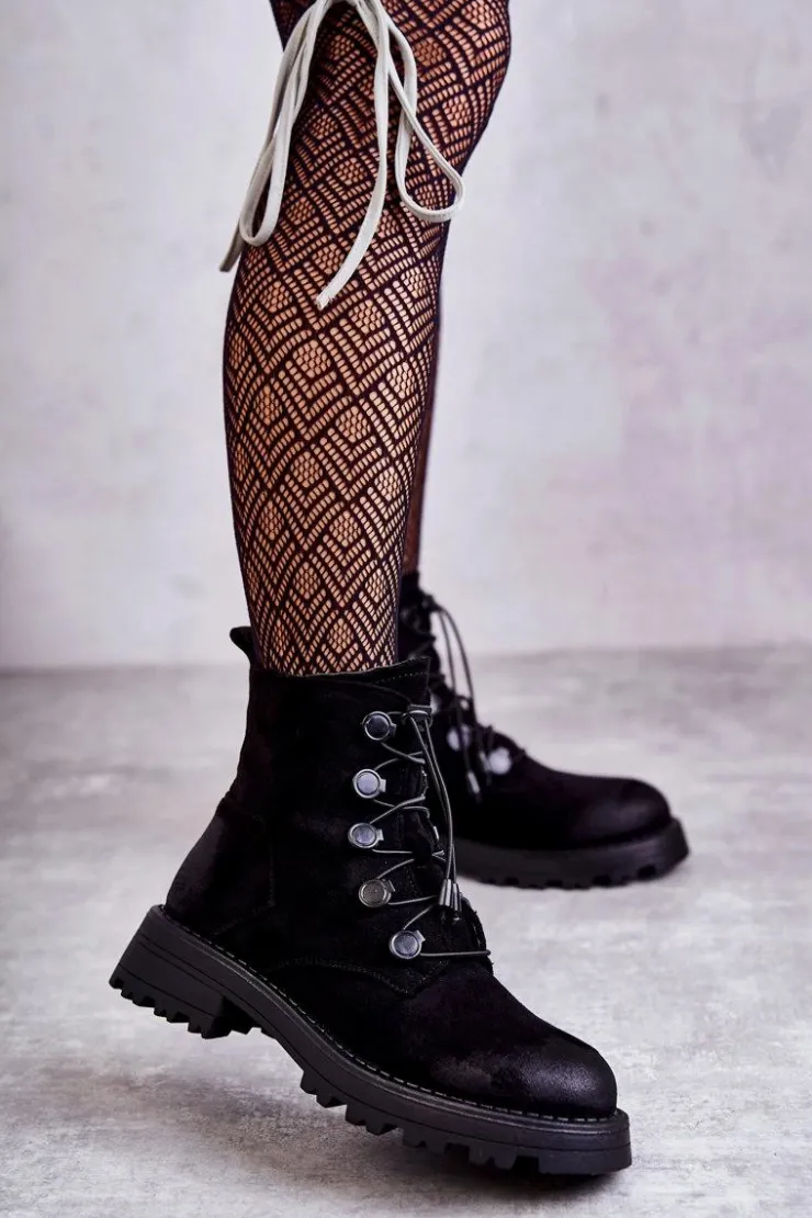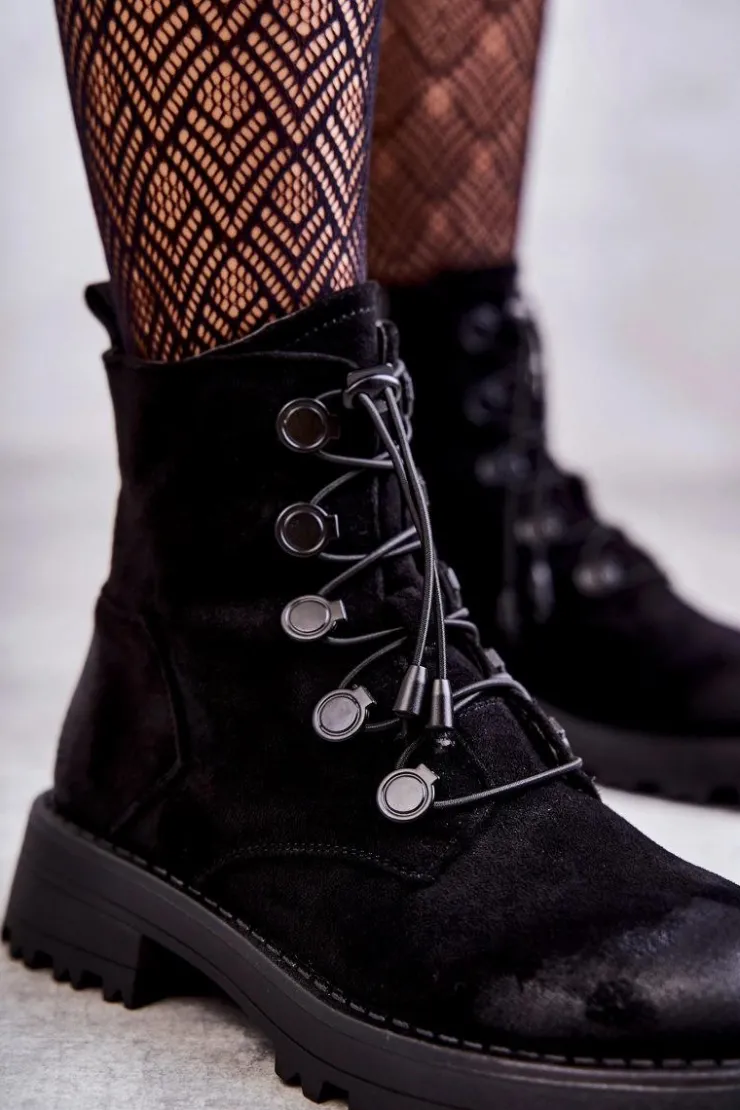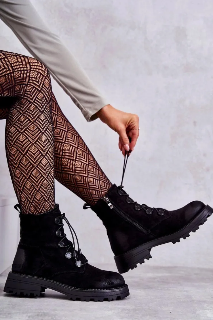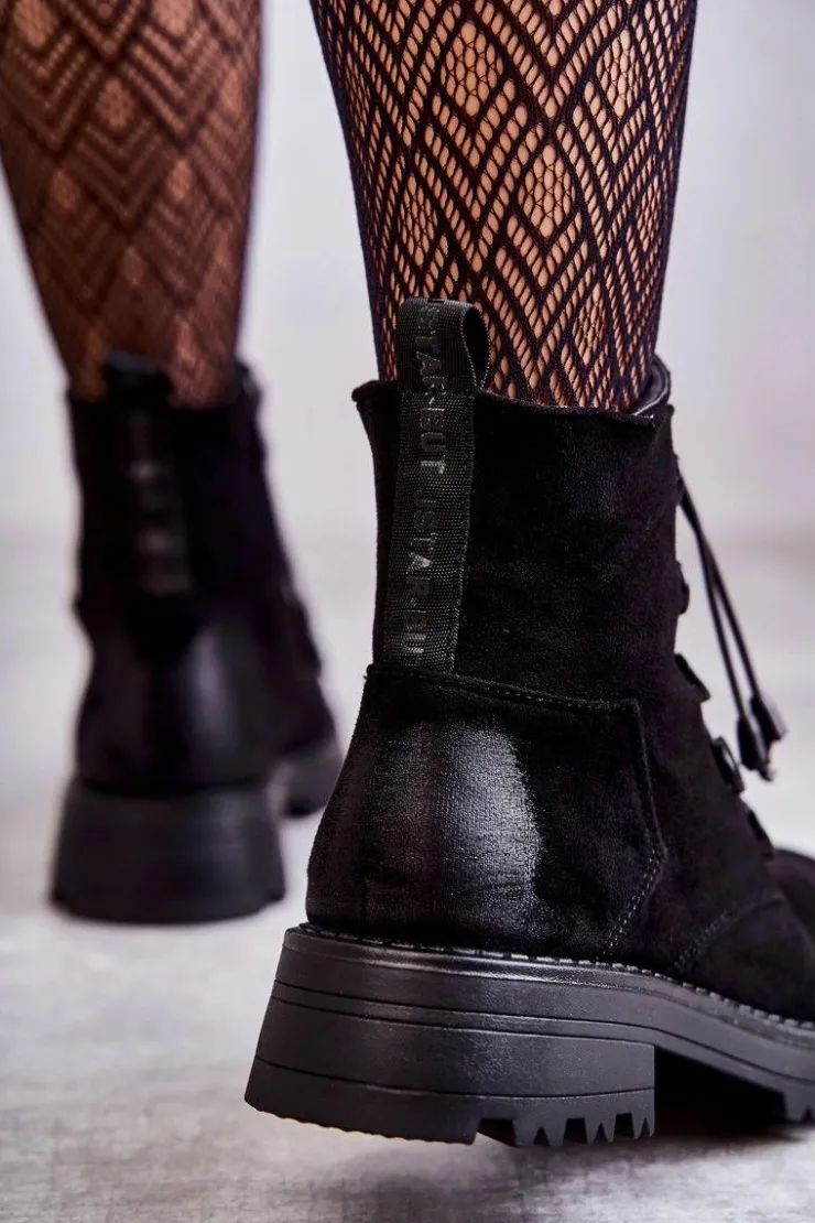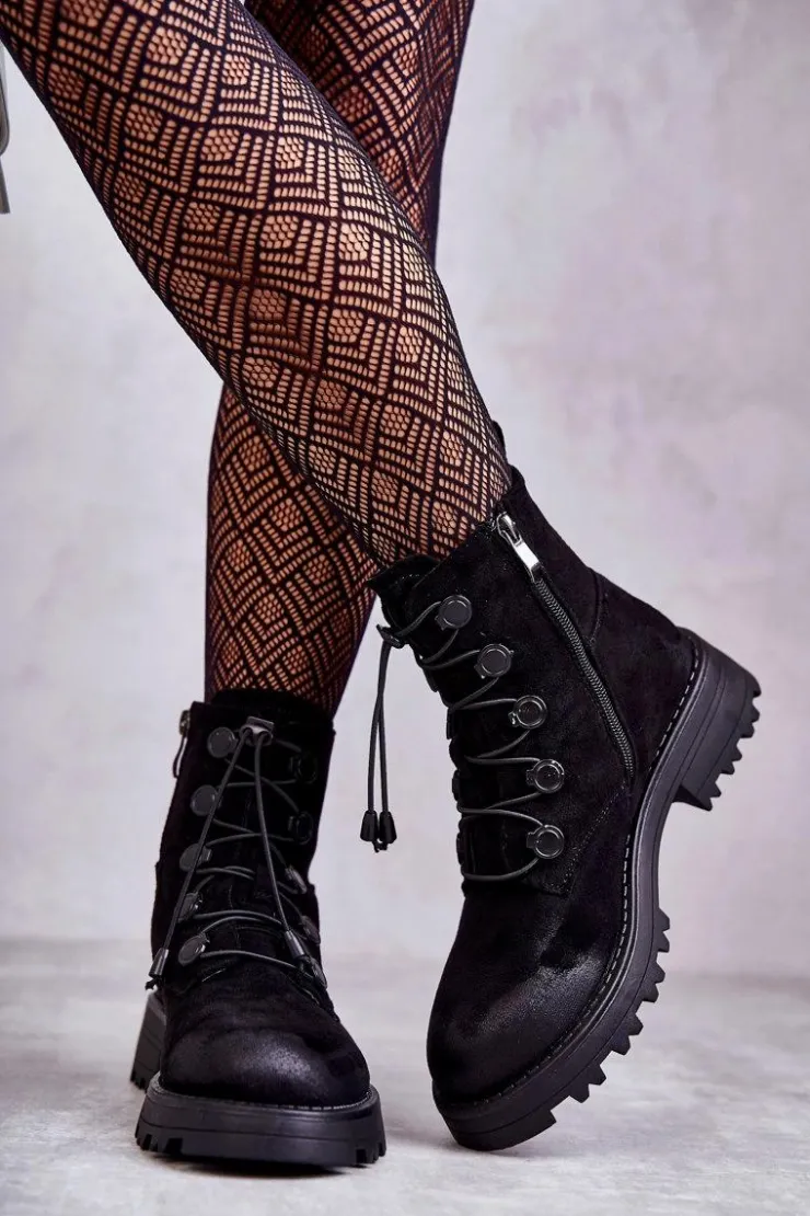 Damskie botki posiadają z przodu ściągacz oraz suwak ułatwiający zakładanie obuwia z boku cholewki. Botki osadzone na płaskim obcasie z bieżnikiem, co gwarantuje stabilność na każdym kroku oraz wygodę w użytkowaniu. Dodatkowo botki posiadają usztywniany zapiętek. Wnętrze tych butów zostało ocieplone kocem obuwniczym. Przy wyborze rozmiaru prosimy sugerować się tabelą rozmiarów.