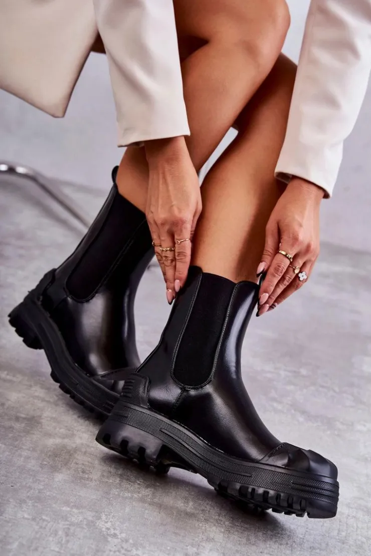 Niezwykłe i stylowe botki damskie zostały wykonane z eko skóry. Model wsuwany. Zapiętek został usztywniony. Na okrągłym nosku znajduje się charakterystyczne wzmocnienie z tworzywa sztucznego. Botki osadzone są na platformie oraz płaskim obcasie. Wkładka materiałowa. Dodatkowo u góry cholewki znajdują się pętelki ułatwiające zakładanie obuwia. Przy wyborze rozmiaru prosimy sugerować się tabelą rozmiarów.
