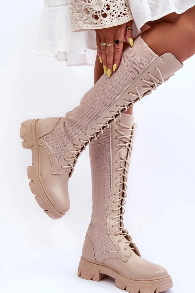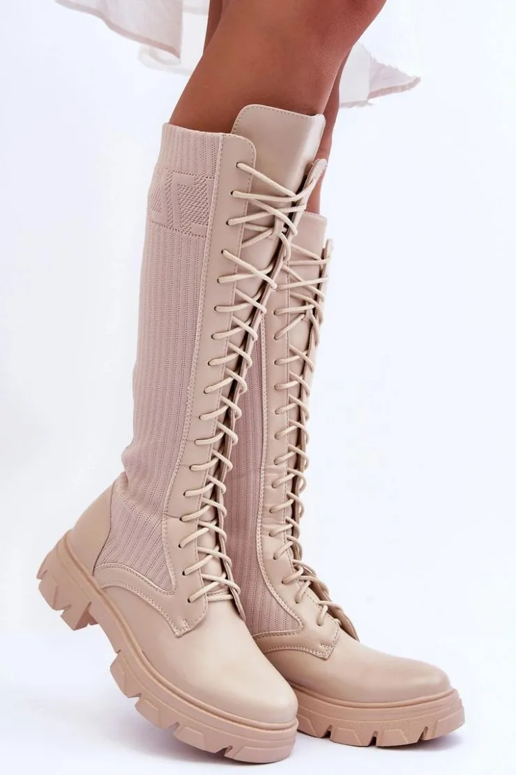 Modne damskie kozaki zostały wykonane z połączenia eko skóry oraz elastycznej tkaniny. Cholewka do kolana. Model osadzony na płaskim obcasie i platformie. Buty te posiadają usztywniany zapiętek. Model wsuwany z dodatkowym wiązaniem. Te klasyczne kozaki świetnie będą pasować do jesiennych stylizacji. Modny fason, który powinnaś mieć! Przy wyborze rozmiaru prosimy kierować tabelą rozmiarów.