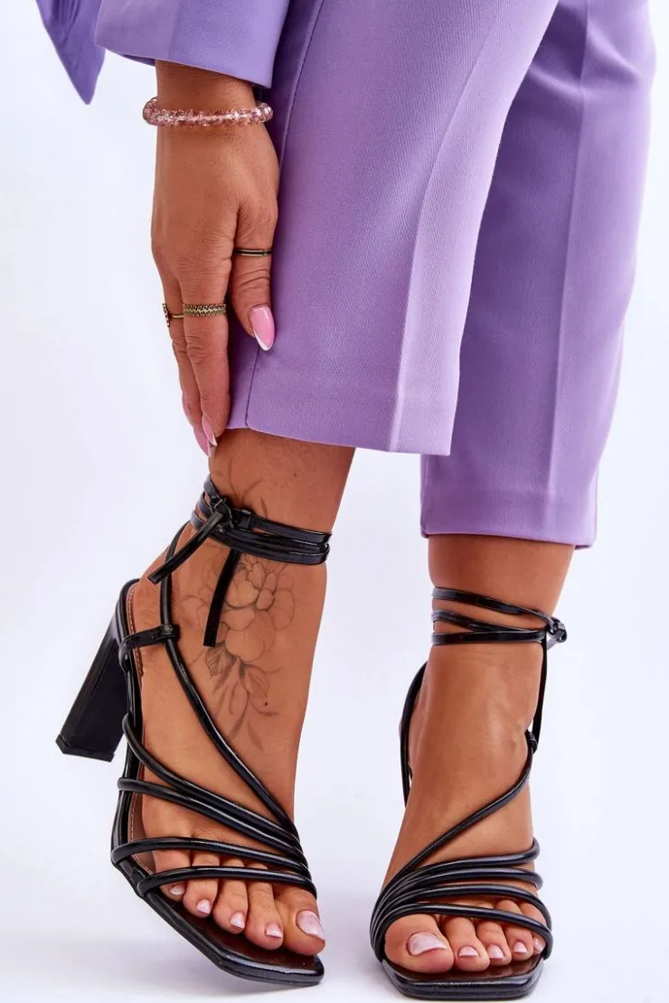 Eleganckie sandały damskie zostały wykonane z eko skóry. Model posiada wiązanie wokół łydki. Sandałki osadzono na płaskim obcasie w postaci słupka. Miękka wkładka z eko skóry zapewni komfortowe użytkowanie obuwia. Sandałki posiadają odkryty, kwadratowy nosek. Ten fason świetnie sprawdzi się do letnich sukienek czy eleganckich spodni. Przy wyborze rozmiaru prosimy sugerować się tabelą rozmiarów.