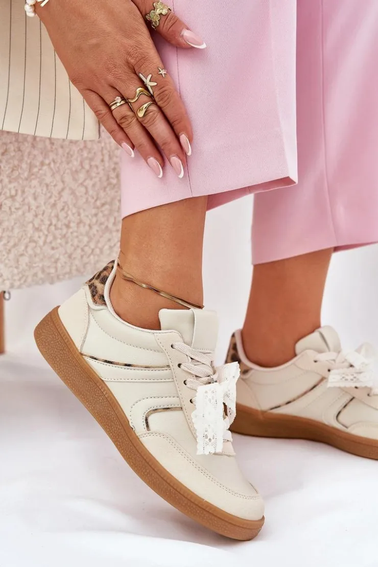 Stylowe sneakersy damskie z eko skóry o niskim fasonie, które łączą komfort z modnym wyglądem. Wyjmowana piankowa wkładka, pokryta materiałem, zapewnia wygodę i odpowiednią amortyzację przez cały dzień. Na sznurowaniu znajduje się koronka, którą można odpiąć, dając możliwość dostosowania wyglądu do własnych preferencji. Doskonałe do codziennych stylizacji, te sneakersy wyróżniają się unikalnym wyglądem. Przy wyborze rozmiaru prosimy kierować tabelą rozmiarów.