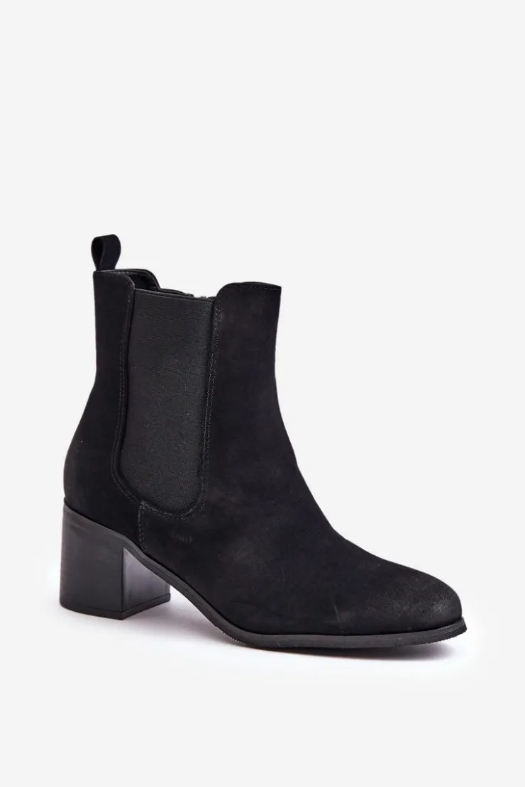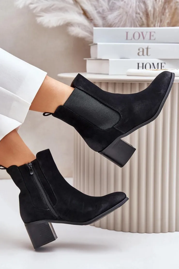 Botki damskie wykonane z eko zamszu. Charakteryzują się obcasem w formie słupka oraz zaokrąglonymi noskami. Usztywniony zapiętek zapewnia stabilność i wygodę podczas użytkowania. Na cholewce elastyczna wstawka. Środek ocieplany kocem obuwniczym. Te botki będą idealnym dodatkiem do jesiennych stylizacji! Przy wyborze rozmiaru prosimy sugerować się tabelą rozmiarów.